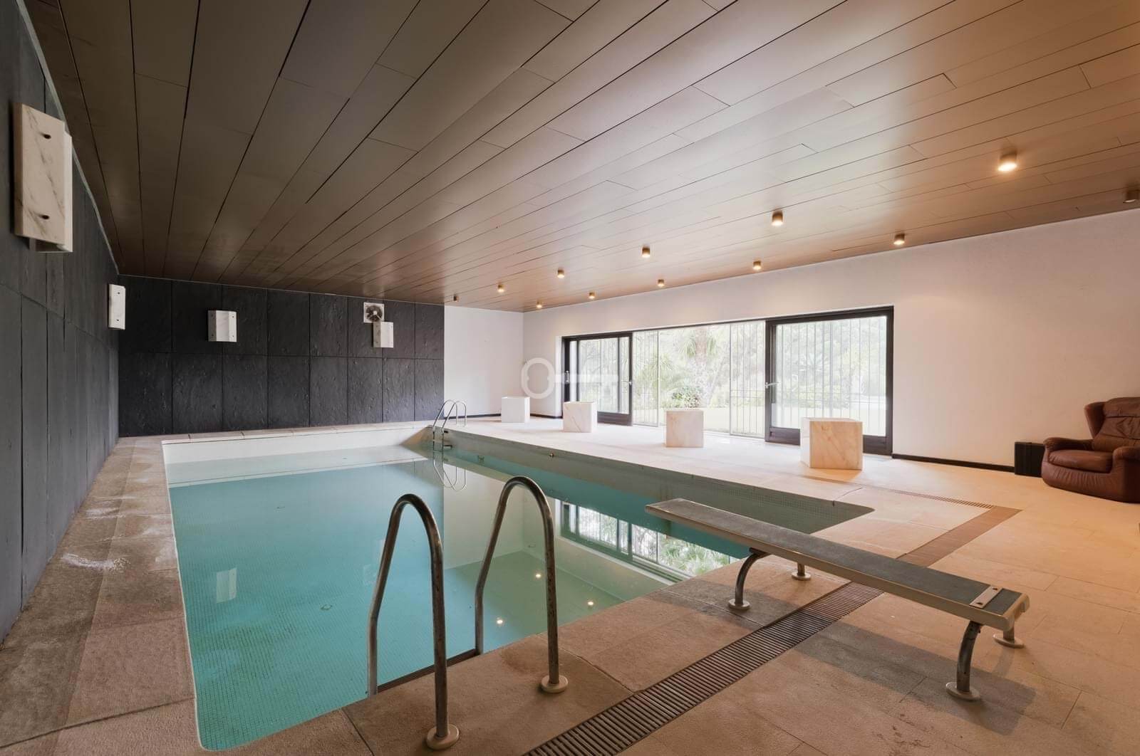 Indoor swimming pool with large glass openings and direct garden access