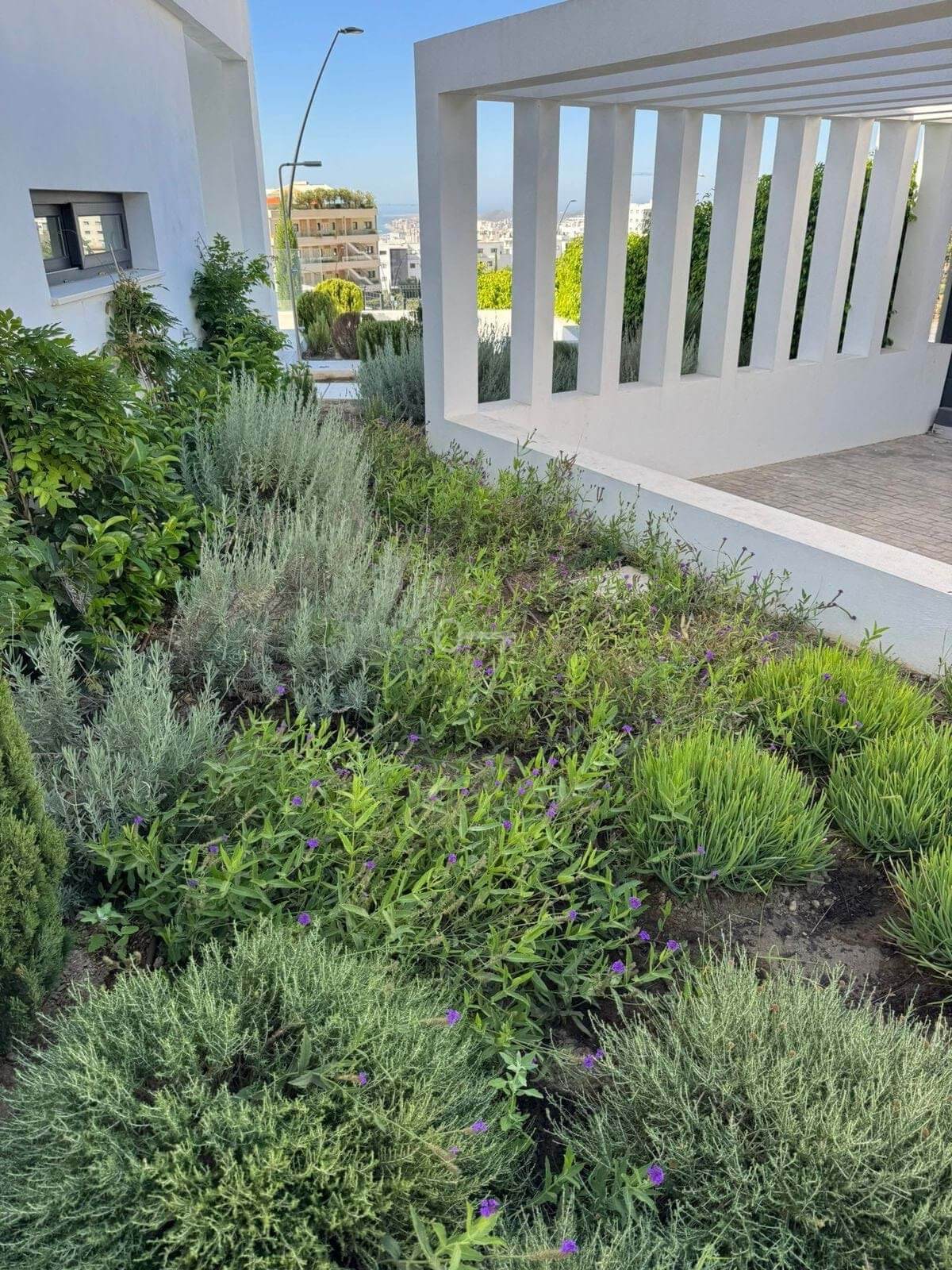 Ogród krajobrazowy z systemem nawadniania, palmy, drzewo oliwne, kwiaty i krzewy