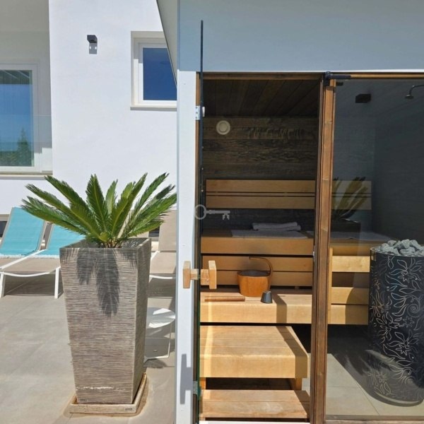 Sypialnie: Cztery przestronne sypialnie, w tym apartament główny z garderobą, łazienką i prywatnym tarasem z widokiem na morze, idealne na chwile relaksu.