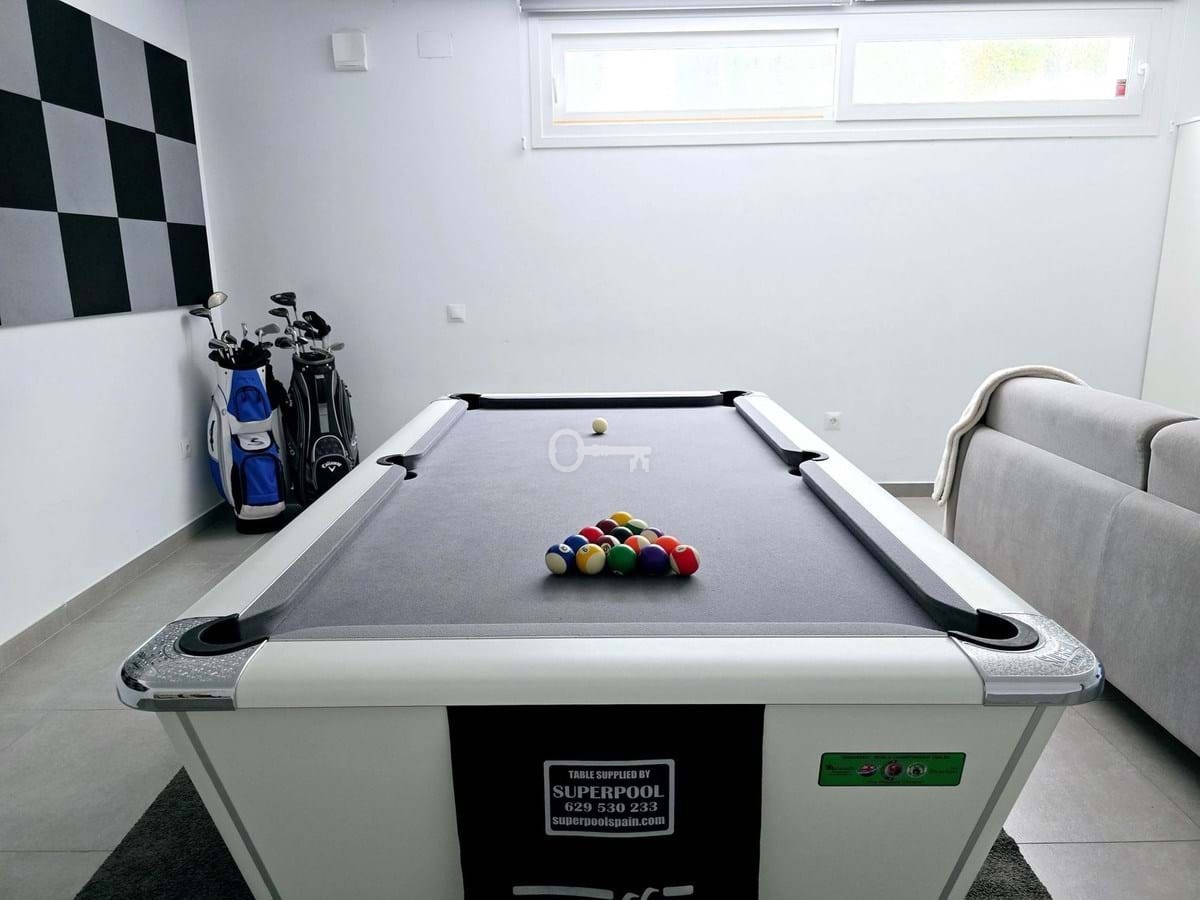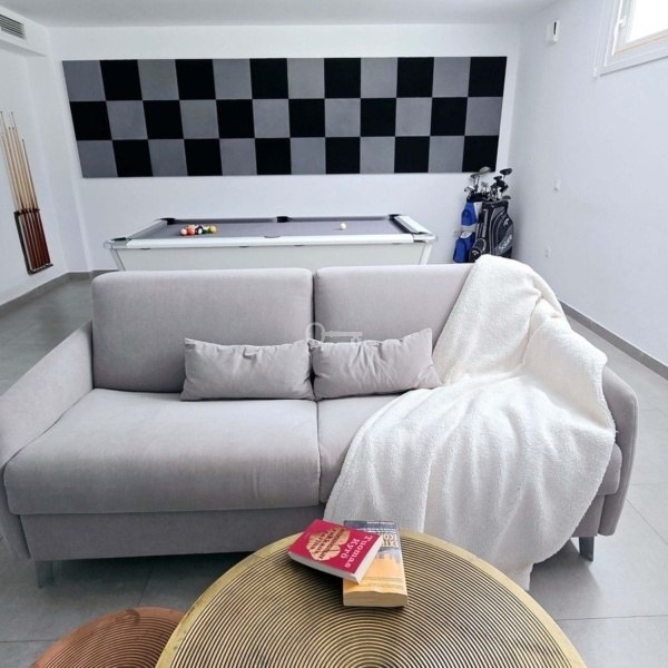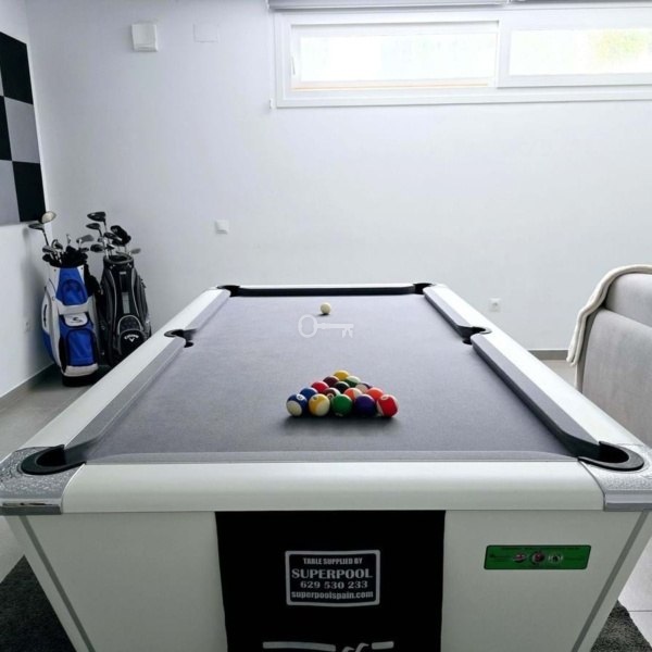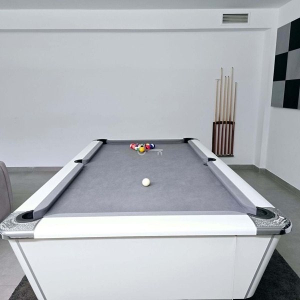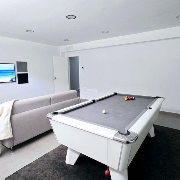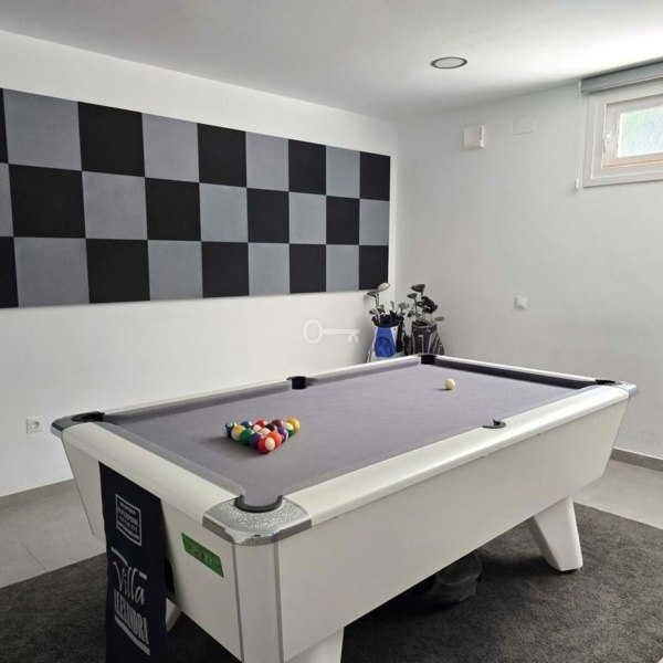 Niższy poziom: Obejmuje pokój gier ze stołem bilardowym, salę kinową, dwie dodatkowe sypialnie i w pełni wyposażoną łazienkę, idealną dla gości lub rodziny.