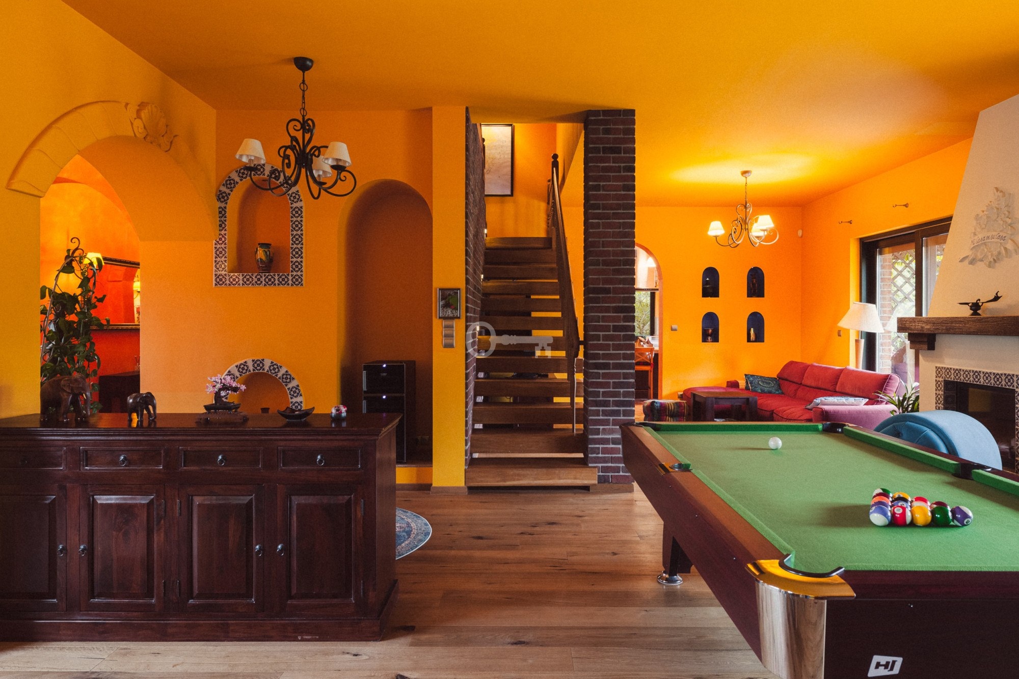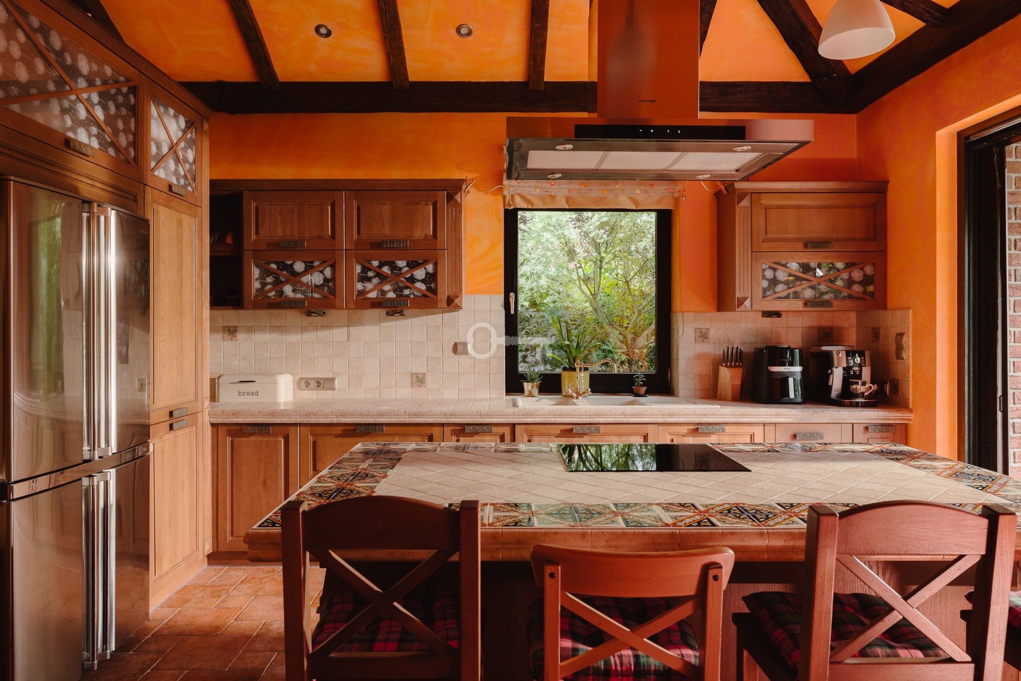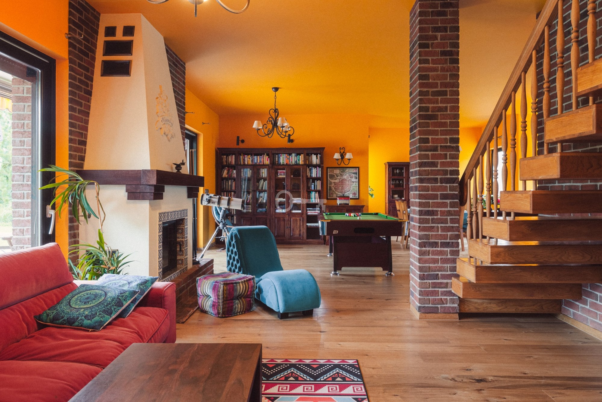 Wnętrze domu zostało wykończone materiałami najwyższej jakości, a ich ciepłe barwy i struktury, zastosowane w całym wnętrzu, sprawiają, że wnętrze jest ciepłe, przytulne, i niezwykle spójne w swojej oryginalnej aranżacji.