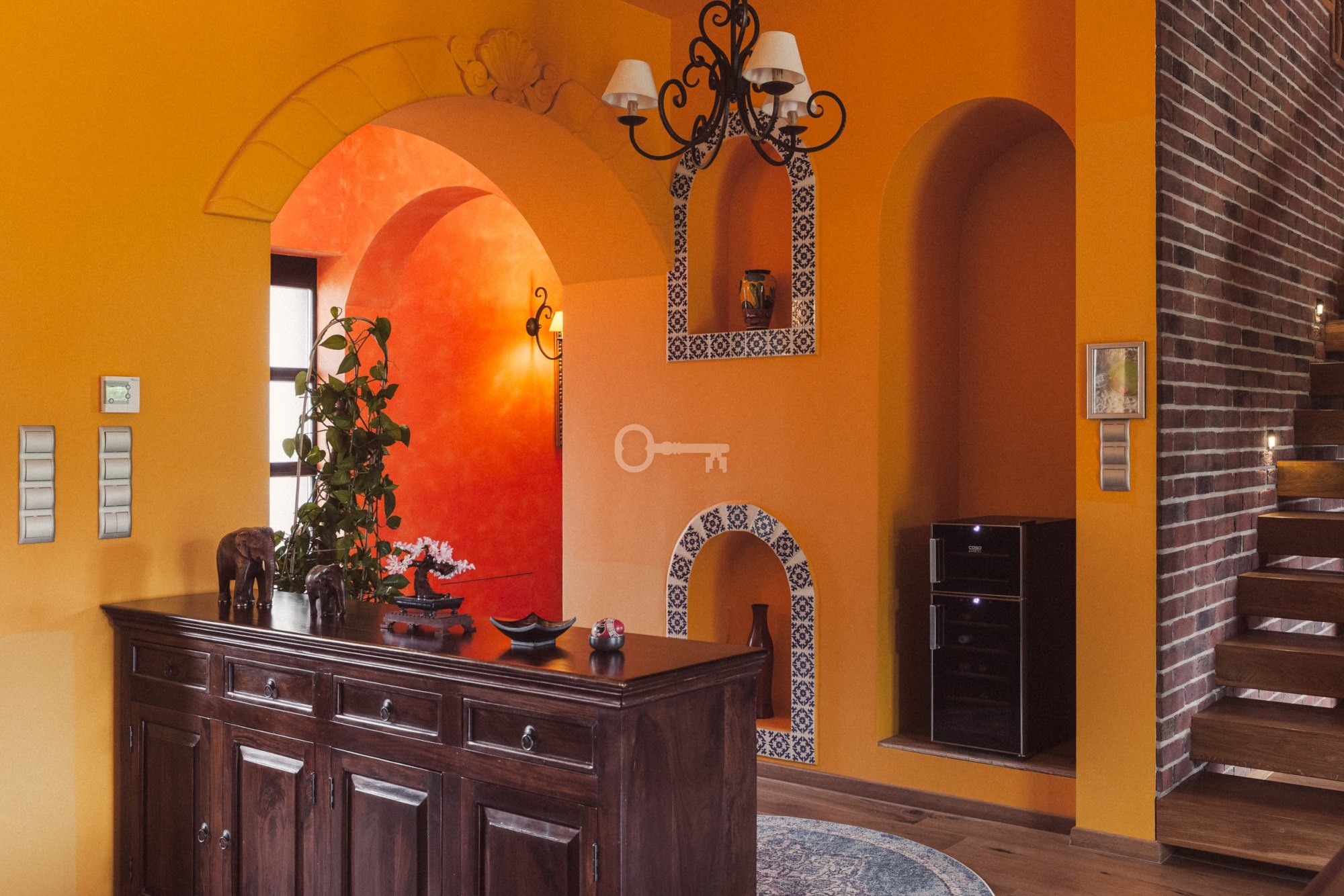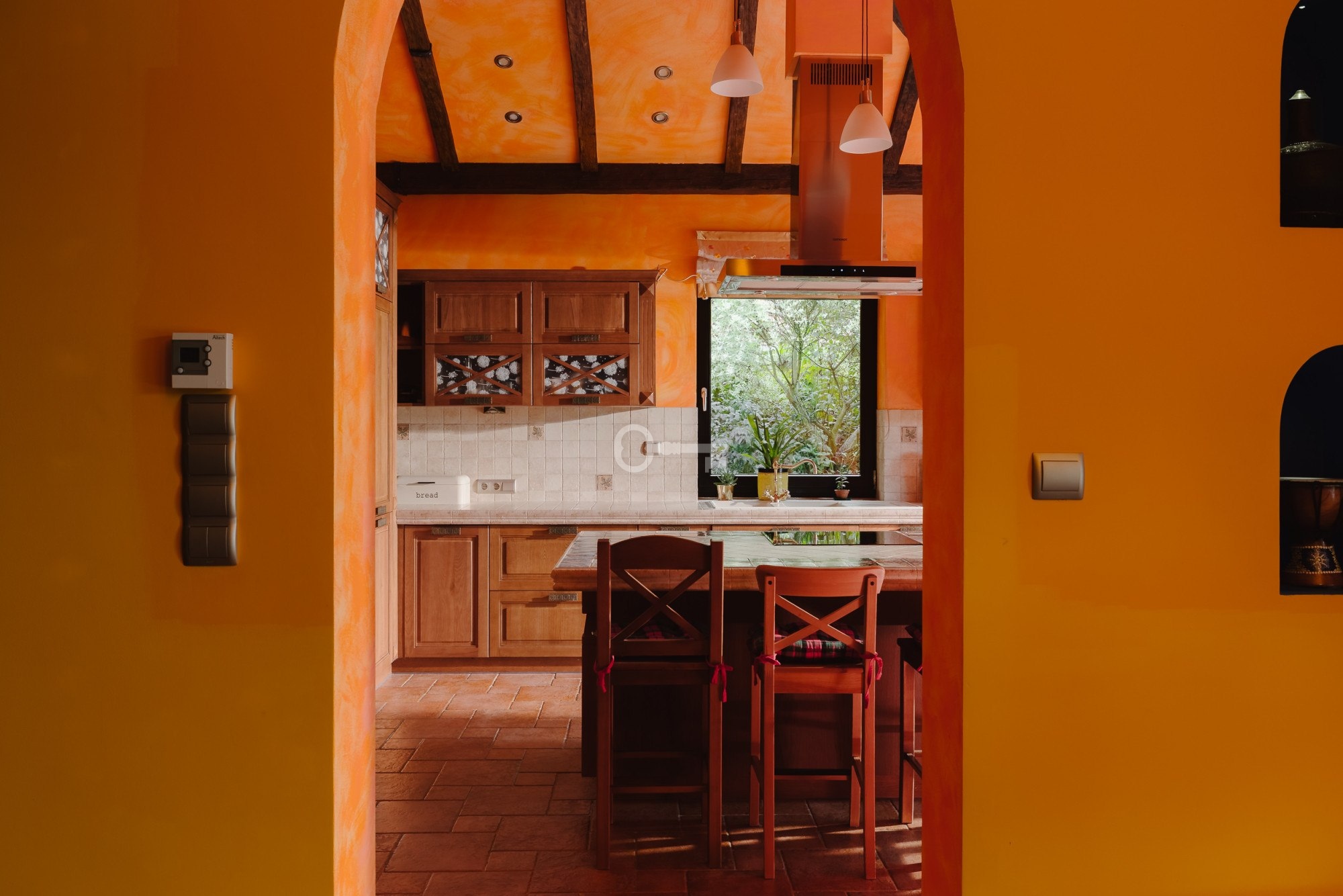 * płytki na blatach w kuchni, na ścianach dolnej łazienki, umywalka w dolnej łazience, dekoracja w salonie są meksykańskie z sklepu Kolory Meksyku,