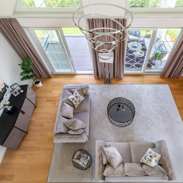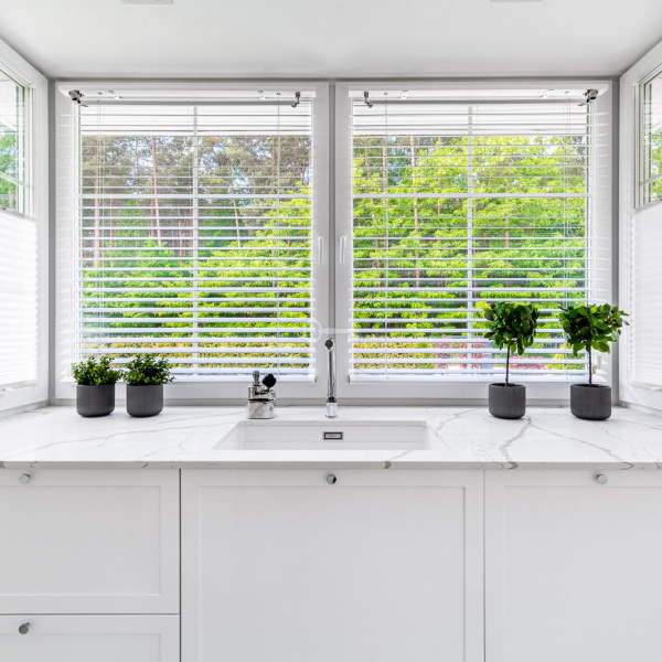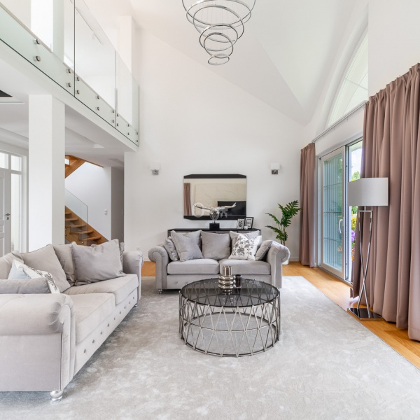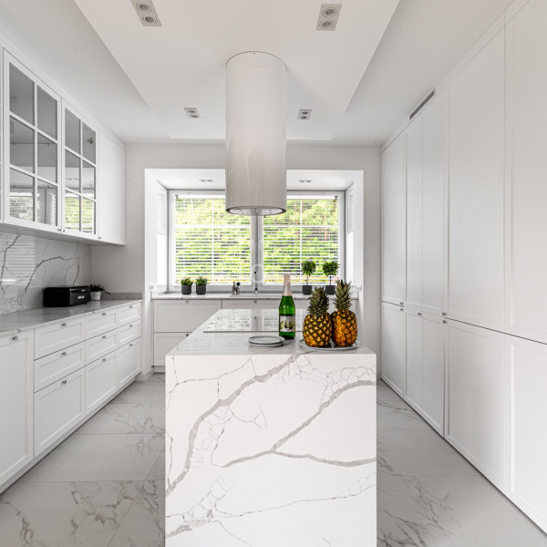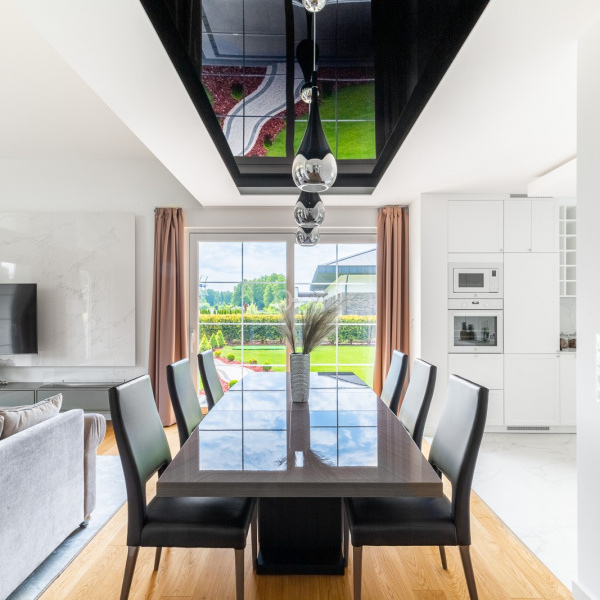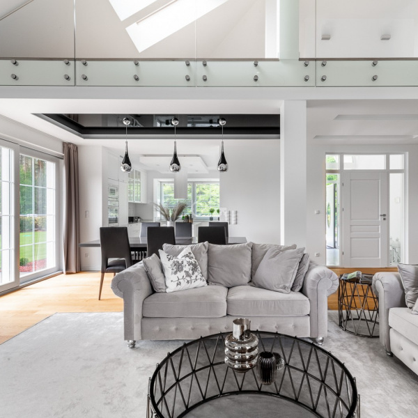 Salon połączony z otwartą kuchnią, wszystko utrzymane w odcieniach bieli co przy bardzo dobrym położeniu względem stron świata daje nam doskonałe nasłonecznienie i światło w pomieszczeniach.
