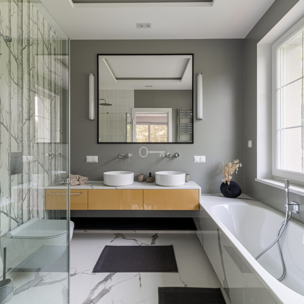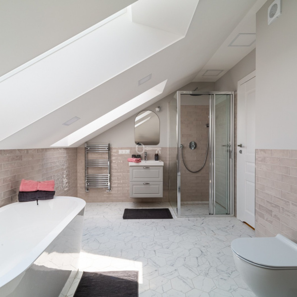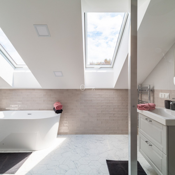 Na parterze domu znajdują się trzy sypialnie z czego jedna w stylu masterbedroom z własną łazienką i garderobą. Dodatkowa łazienka i toaleta.