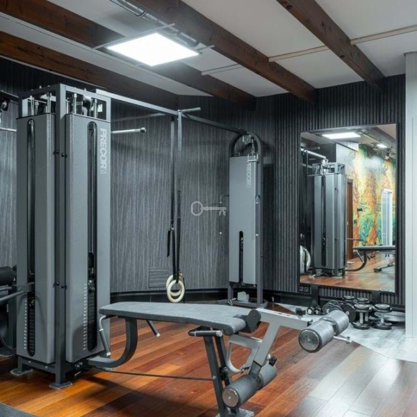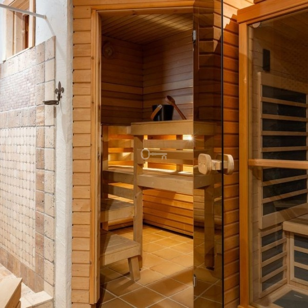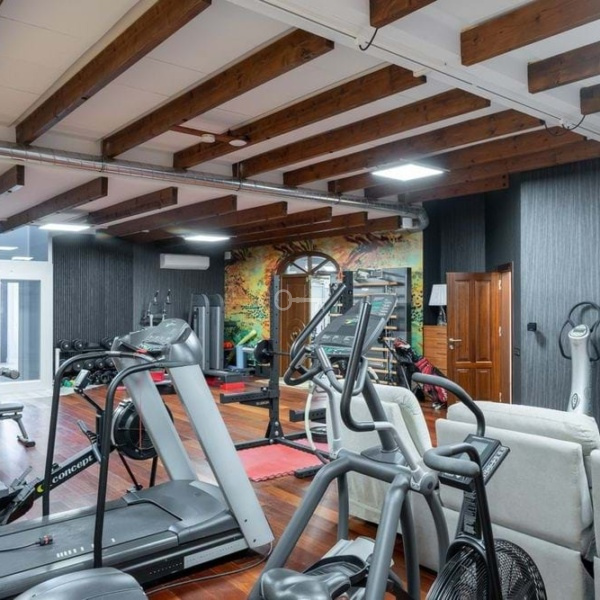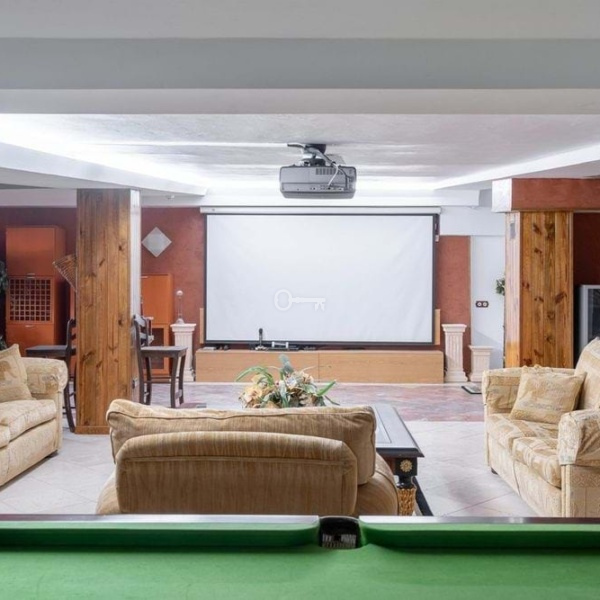 Na parterze znajdują się cztery kolejne sypialnie, każda z drzwiami prowadzącymi prosto do ogrodu i basenu. W pobliżu basenu znajduje się sauna fińska, w której można się zrelaksować. Do tego siłownia i duży garaż. W piwnicy znajduje się fajne kino domowe, miejsce do masażu, tradycyjna sauna i sauna na podczerwień oraz jeszcze jedna sypialnia z własną łazienką.