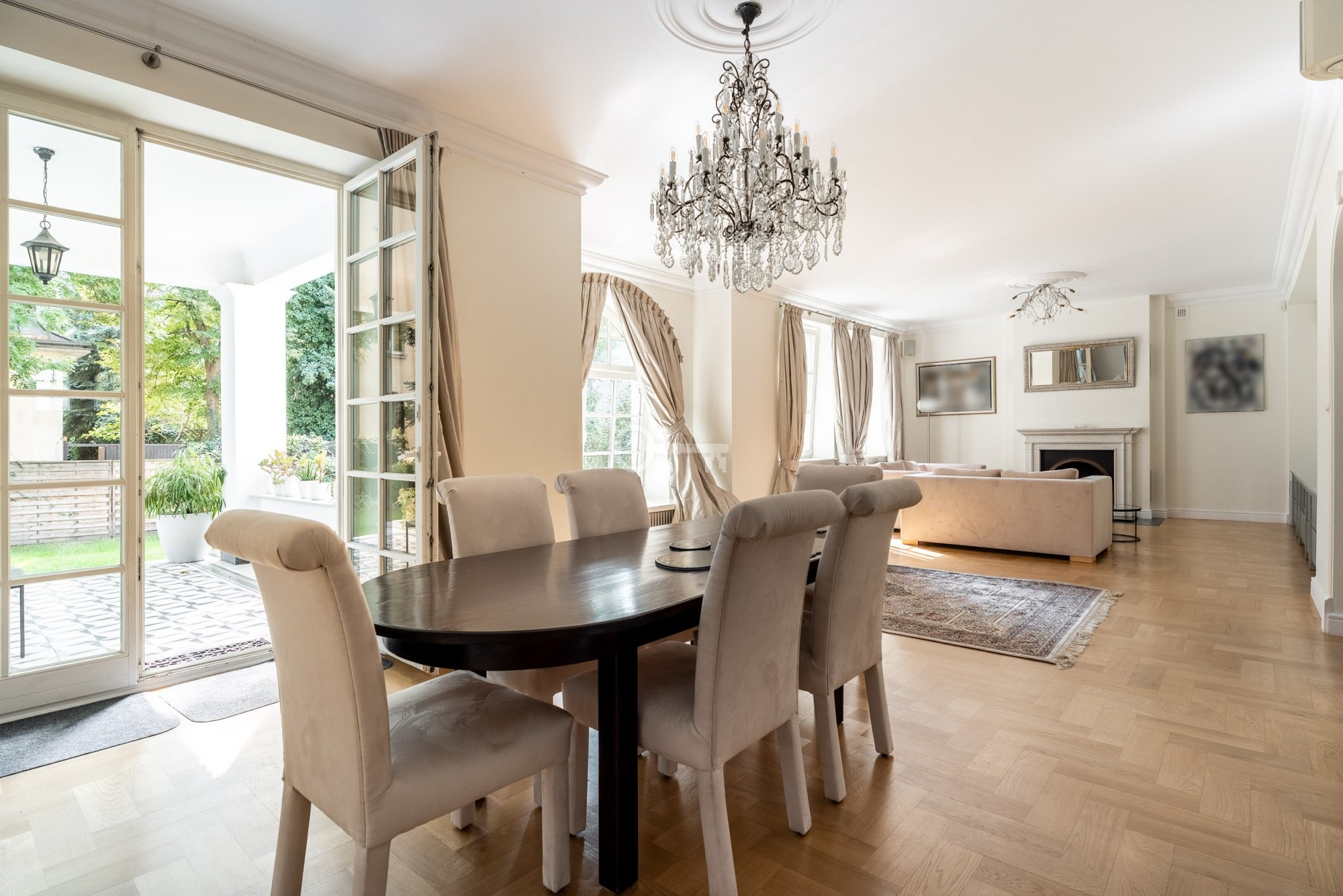 * salon z kominkiem połączony z jadalnią.