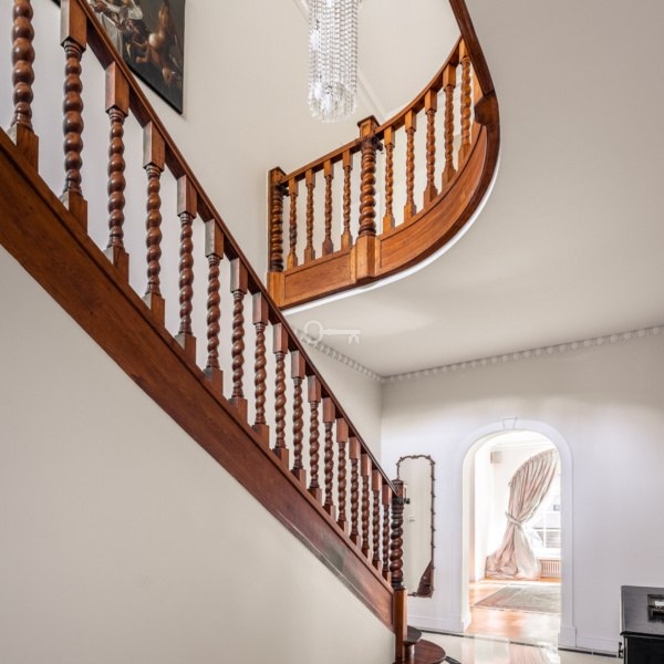 * Reprezentacyjny hol z kamienną podłogą którego dekoracją jest przepiękna oryginalna klatka schodowa,