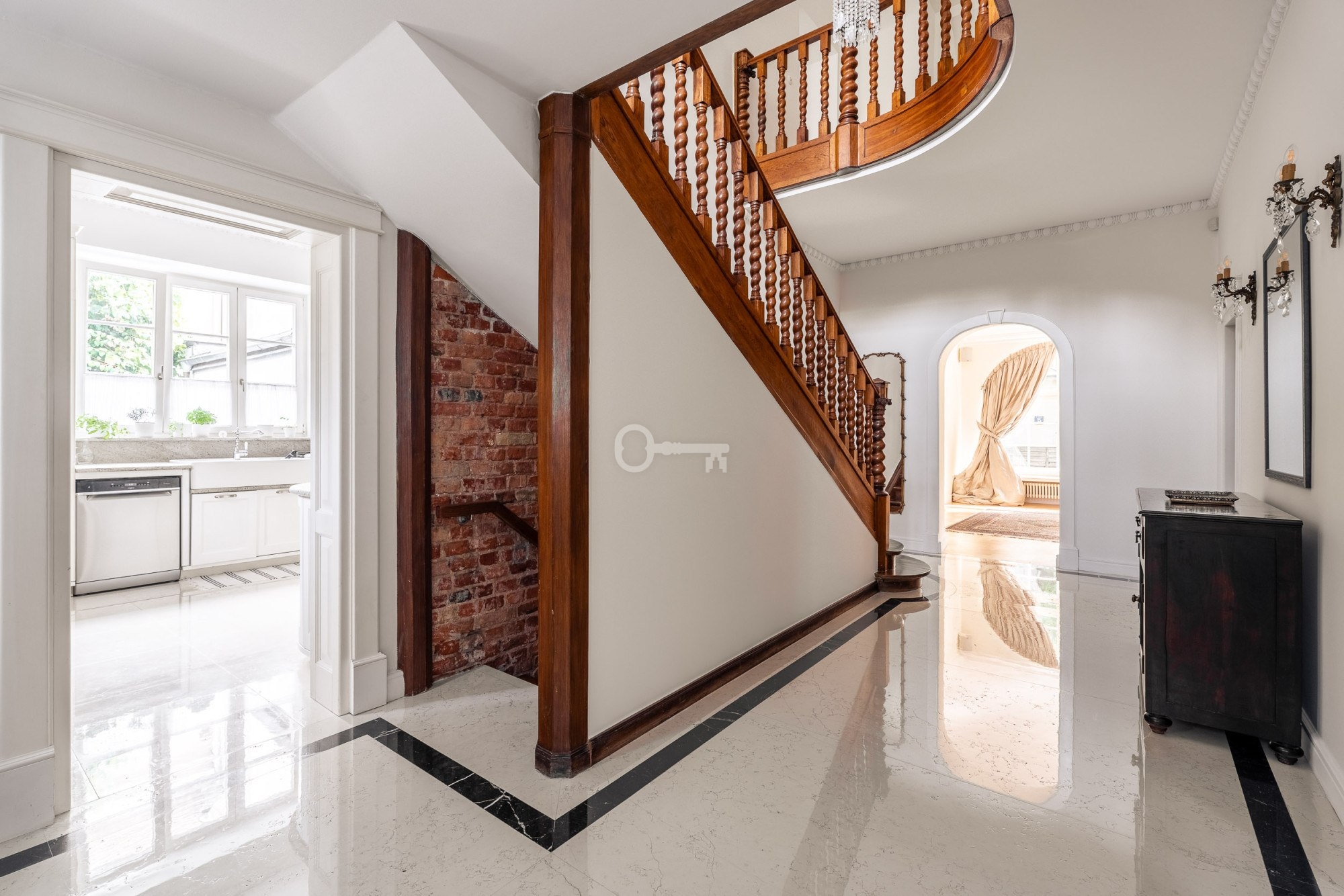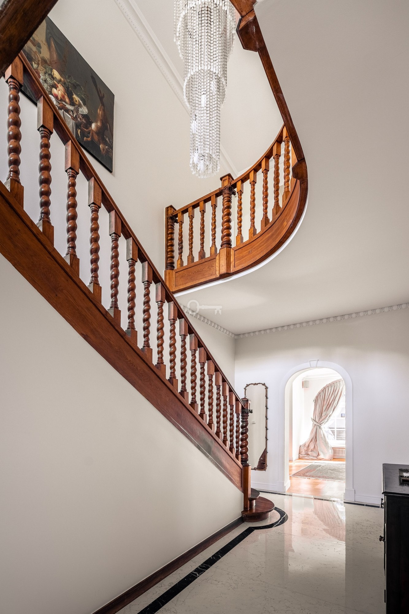 * reprezentacyjny hol z kamienną podłogą którego dekoracją jest przepiękna oryginalna klatka schodowa,