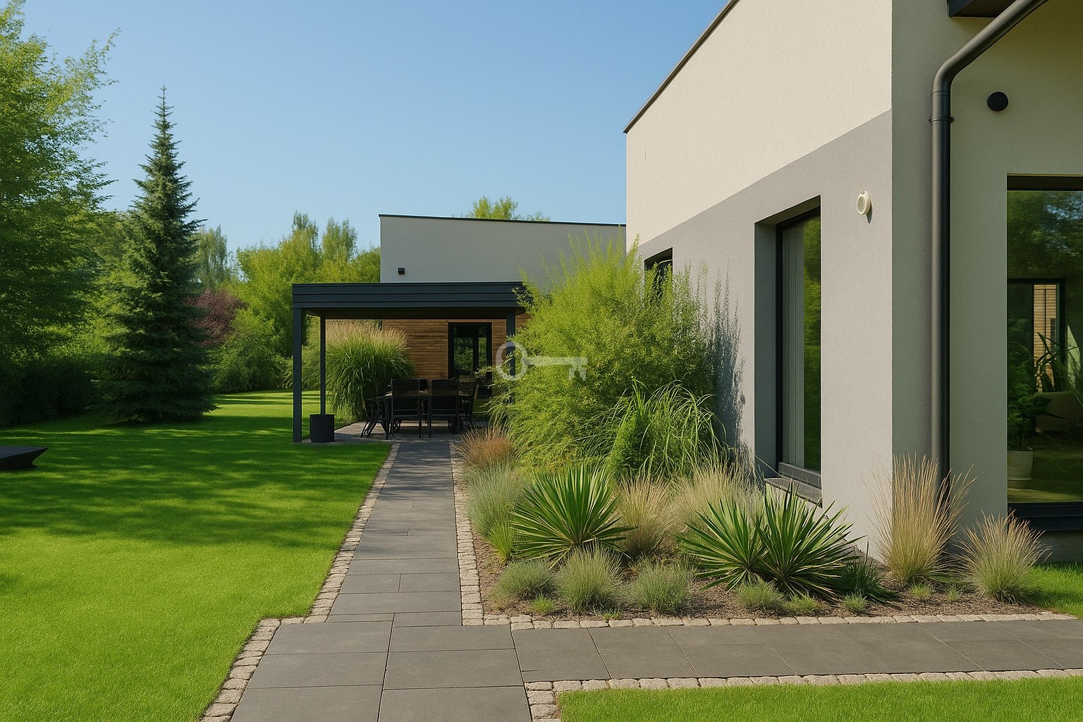 Elegancki, parterowy dom o powierzchni 305 m2 zachwyca nie tylko swoją nowoczesną formą w kształcie litery L, ale także przemyślanym rozkładem pomieszczeń, który zapewnia idealne oddzielenie strefy dziennej od prywatnej.