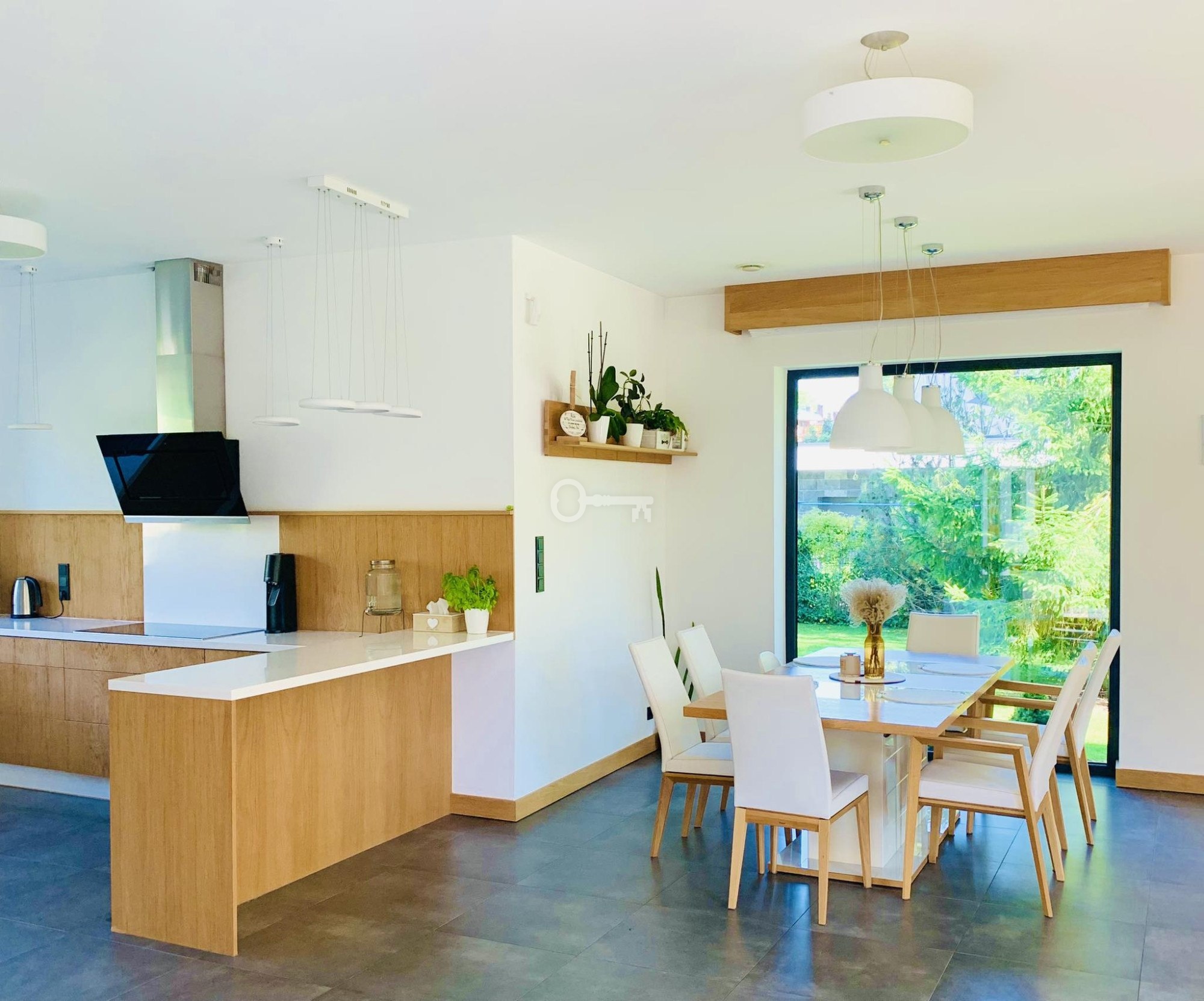 Ogromne okna panoramiczne otwierają wnętrza na ogród i naturalne światło, tworząc przestrzeń pełną harmonii i komfortu. Dom został wykończony z dbałością o każdy detal – zastosowano materiały najwyższej klasy, a kuchnia została w pełni wyposażona w sprzęty AGD premium.