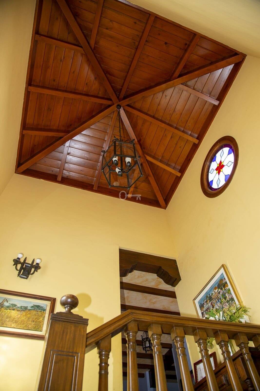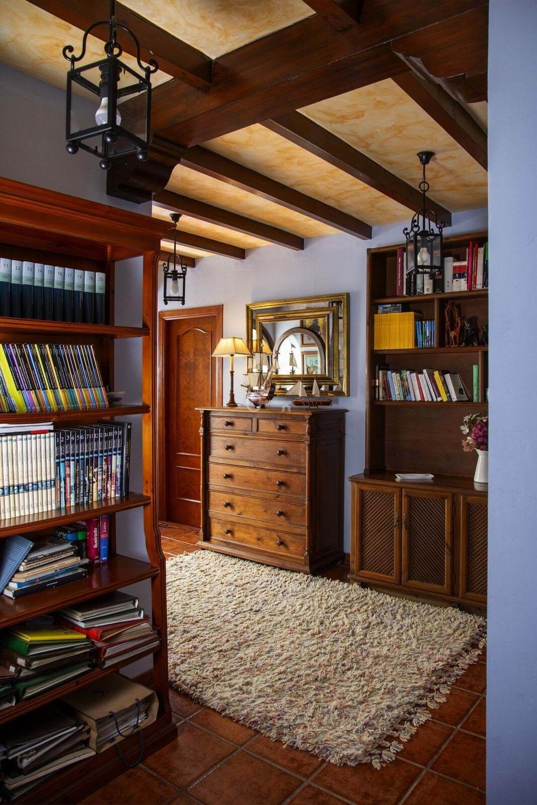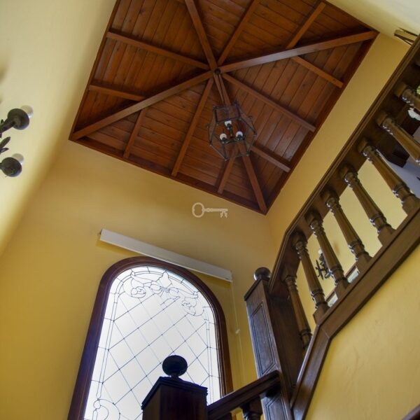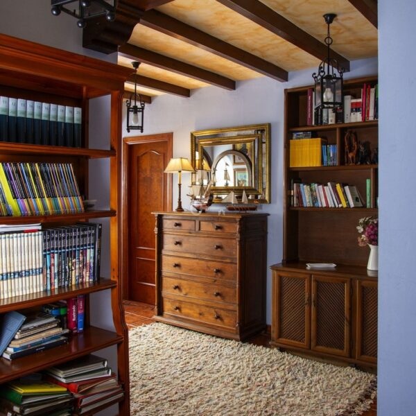 Na piętrze, wchodząc po schodach, ze spektakularnym kasetonowym drewnianym sufitem w formie wieży, znajduje się duży korytarz, który prowadzi do 2 sypialni z dostępem do tarasu, łazienki i dużego biura/biblioteki, które mogą być wykorzystywane do różnych celów w zależności od potrzeb.