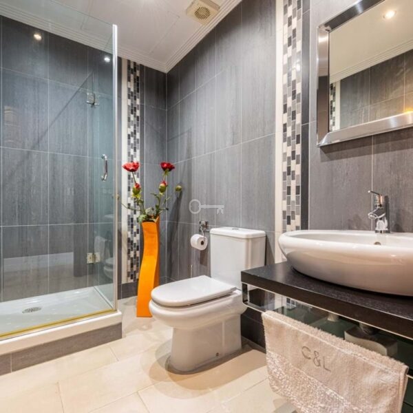 To go downstairs you go to the panoramic window and follow it down to the 2 bedrooms below. Here you also find the huge master bedroom with its own terrace.