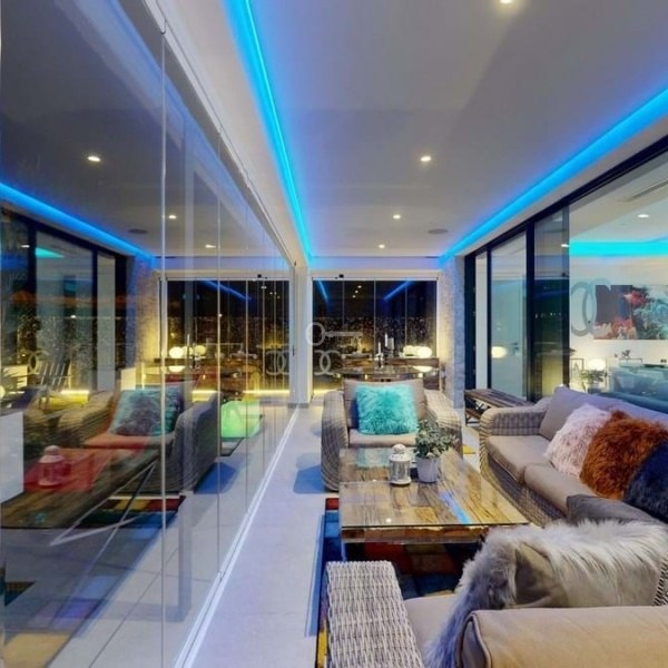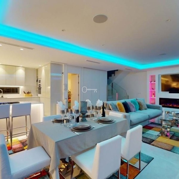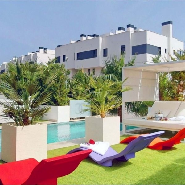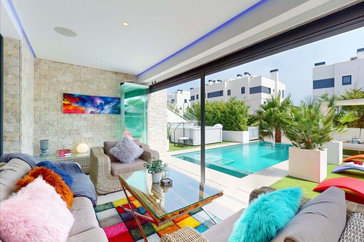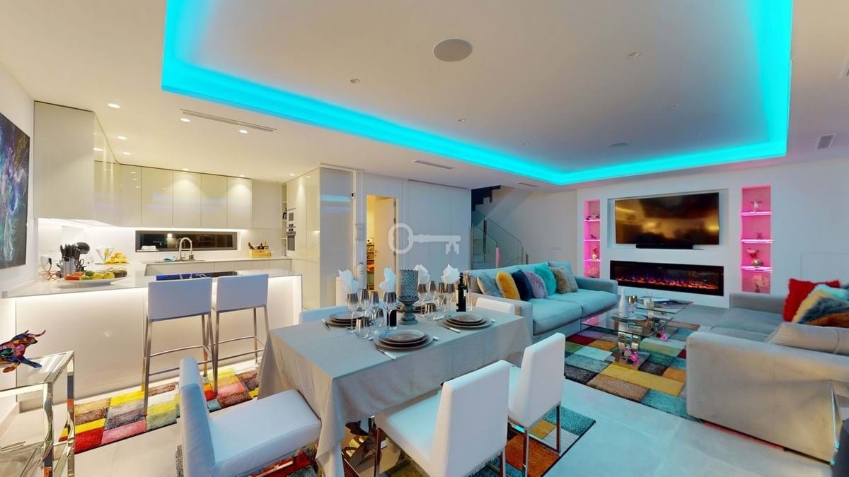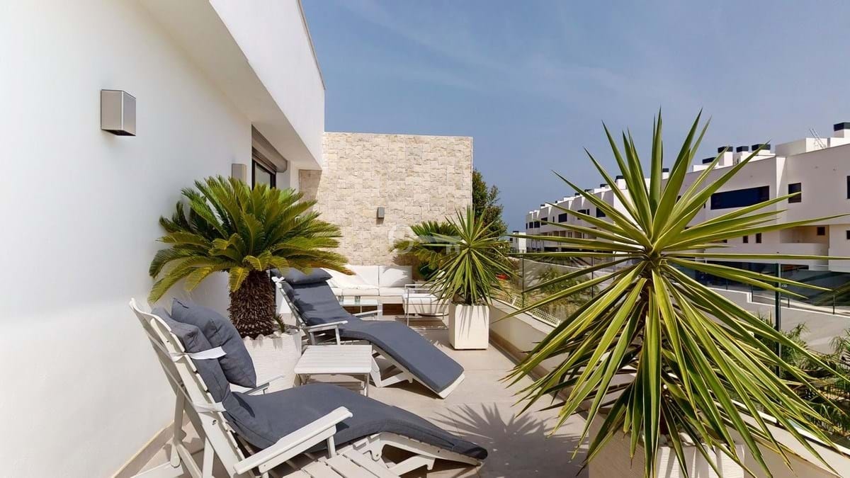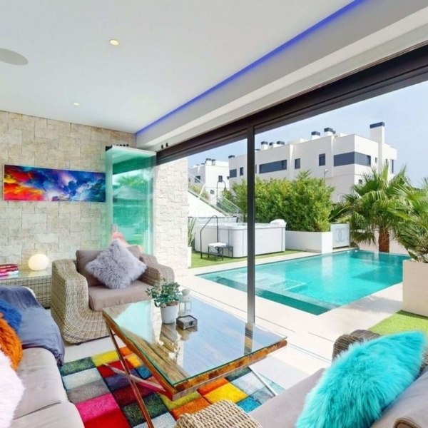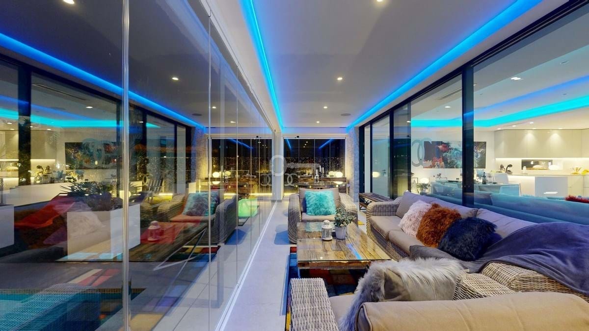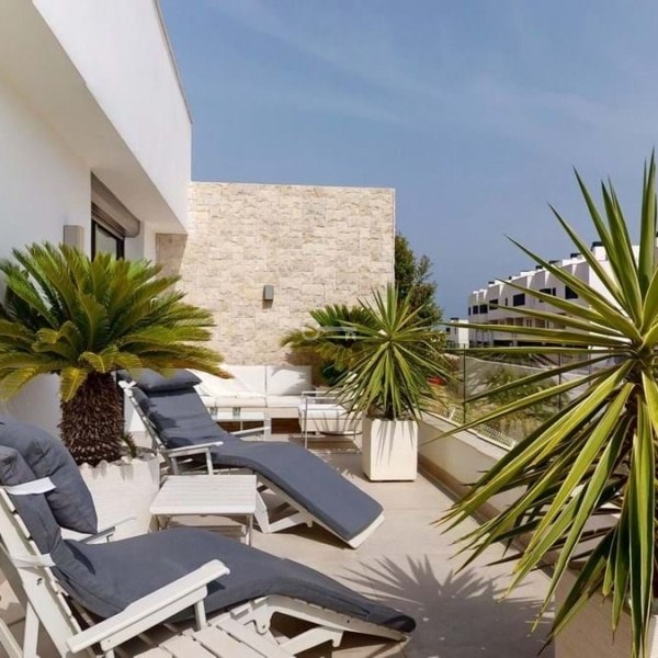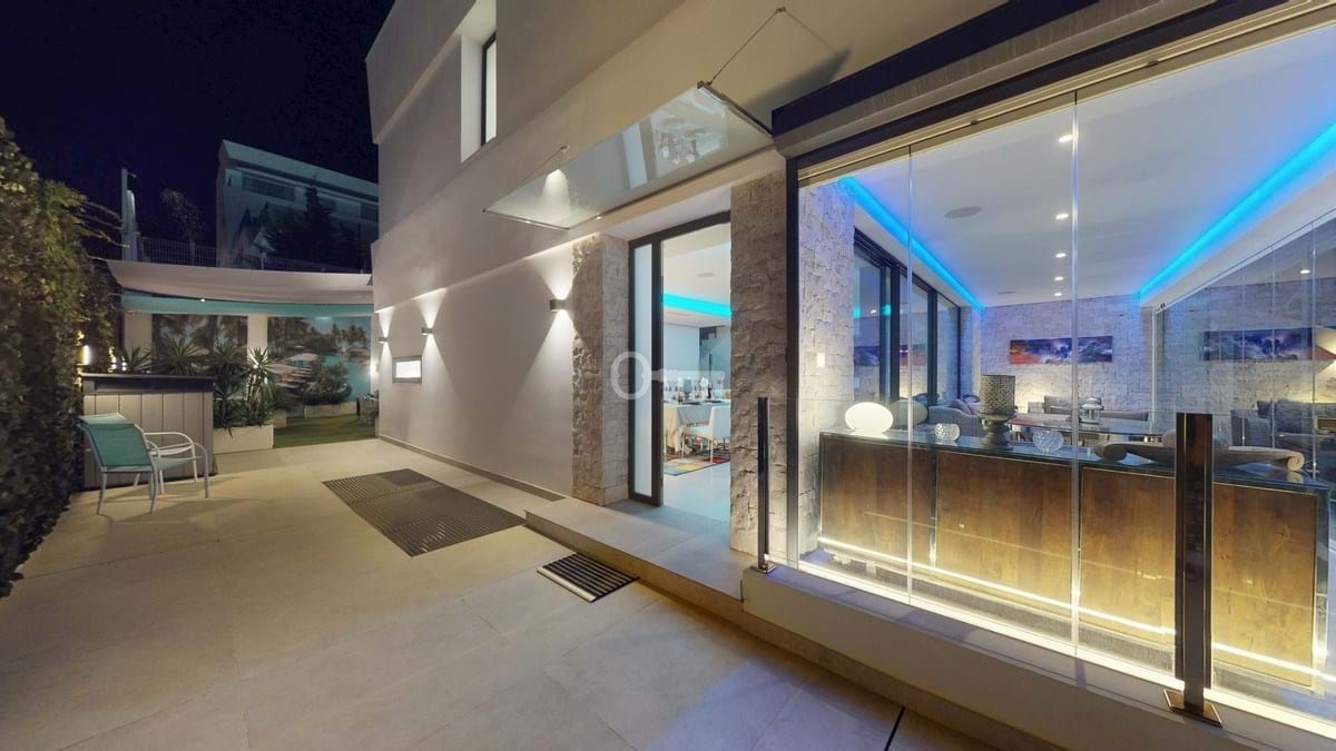 Nieruchomość łączy w sobie nowoczesny design i luksusowe wyposażenie, z przestronnymi wnętrzami obejmującymi salon-jadalnię z kominkiem, nowocześnie wyposażoną kuchnię z jadalnią oraz bezpośredni dostęp do zadaszonych i otwartych tarasów, idealnych do rozrywki na świeżym powietrzu. Posiada cztery sypialnie z łazienkami, wbudowane szafy i wysokiej klasy detale, takie jak automatyka domowa, elektryczne żaluzje, centralne ogrzewanie, klimatyzacja ciepło/zimno i system alarmowy.