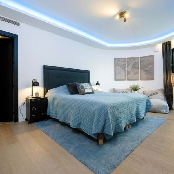 Na drugim piętrze znajdują się dwie piękne sypialnie, obie z łazienką, z których jedna to duża główna sypialnia z widokiem na morze i garderobą.