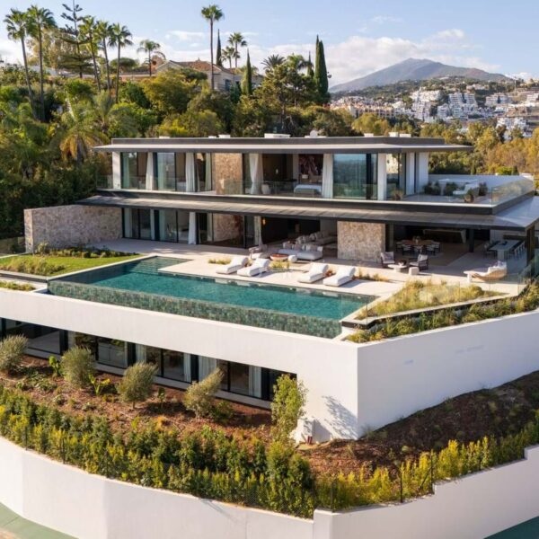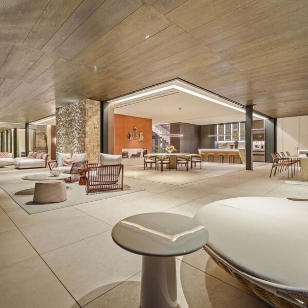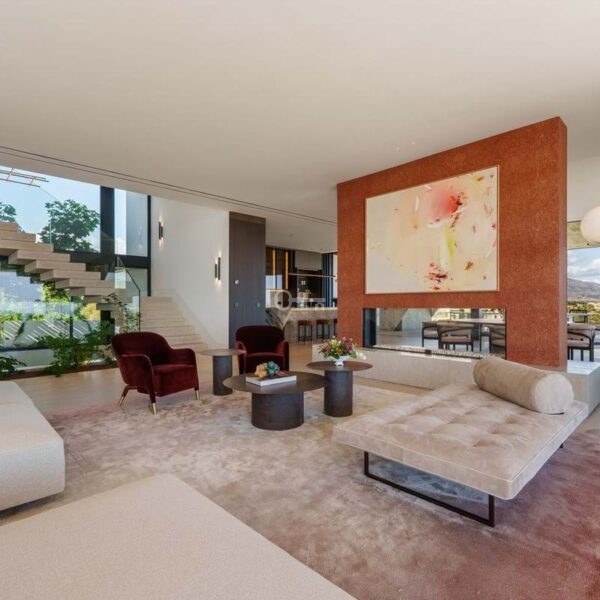 The journey begins along the picturesque tree-lined roads of the exclusive gated community of El Herrojo Alto, leading to the majestic entrance of this extraordinary home. A spacious entryway welcomes you into a modern property enhanced with natural materials.