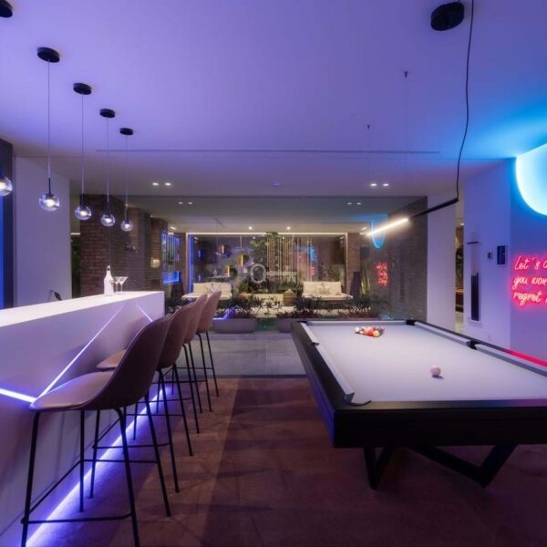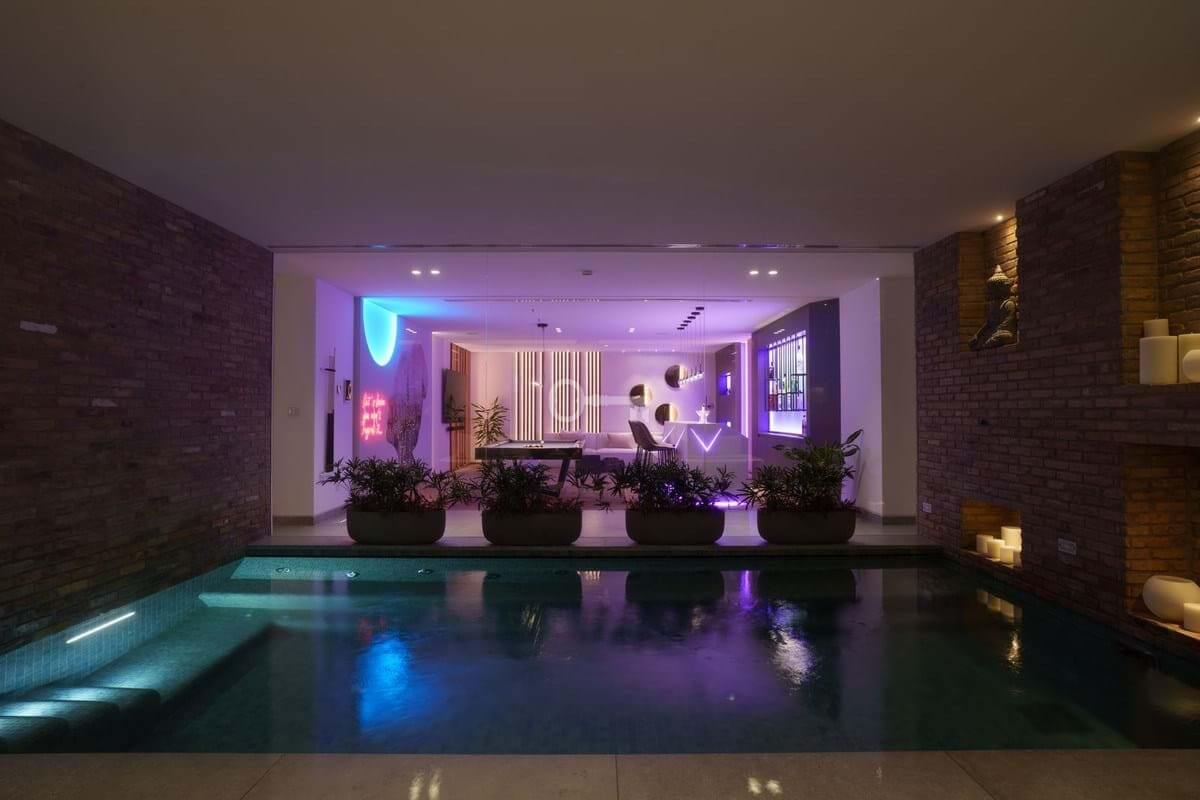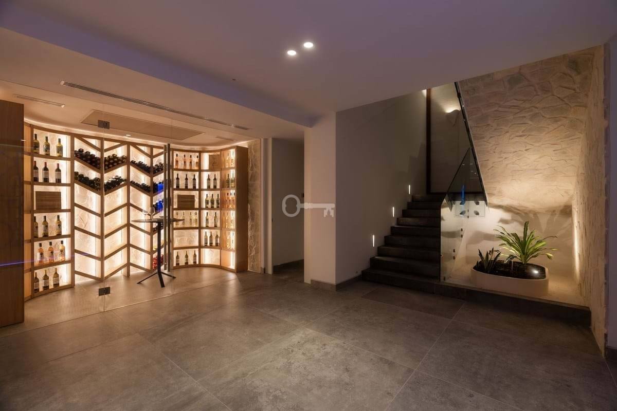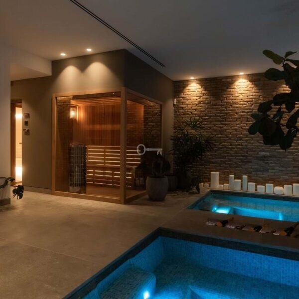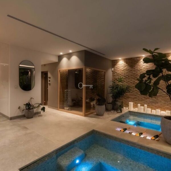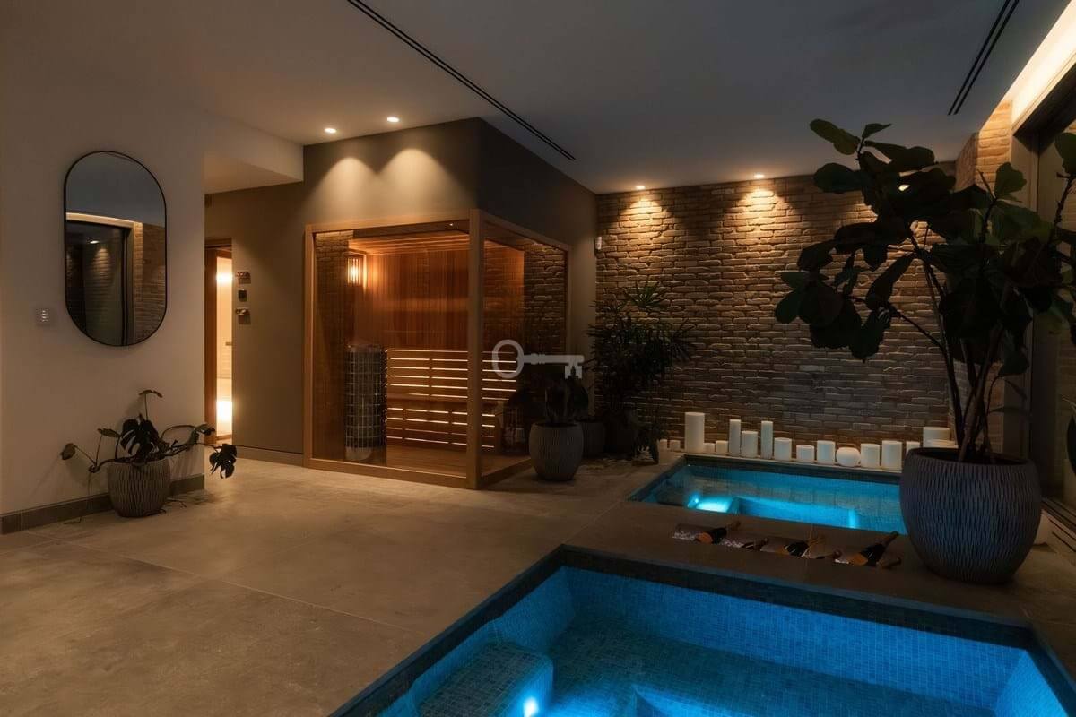 This villa features a private spa, complete with an indoor heated pool, sauna, steam room, and a dedicated massage area. A fully equipped gym fitted with Eleiko gear allows you to stay active without ever leaving home, while the spacious entertainment room offers the ideal setting for movie nights, games, or simply relaxing with family and friends.