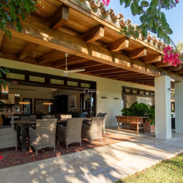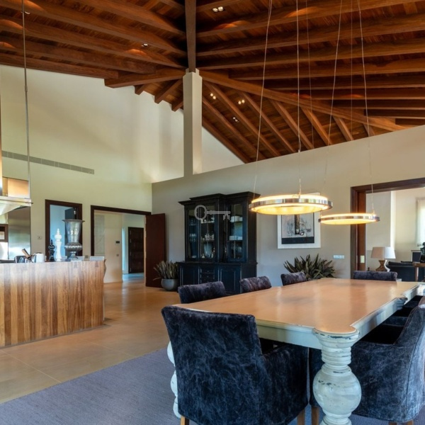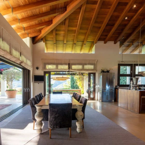 Otwarta, w pełni wyposażona amerykańska kuchnia i jadalnia z wysokimi drewnianymi belkami stropowymi i składanymi drzwiami prowadzącymi na prywatny taras, zapewniające idealne wrażenia z życia wewnątrz / na zewnątrz, które są tak pożądane w Hiszpanii.