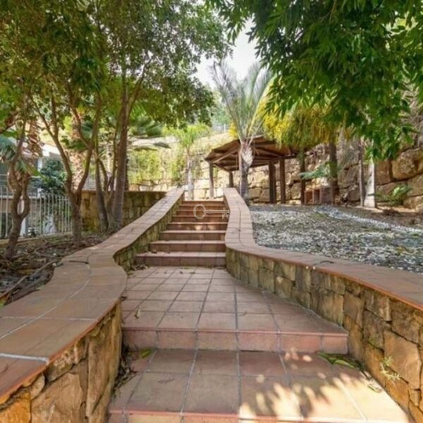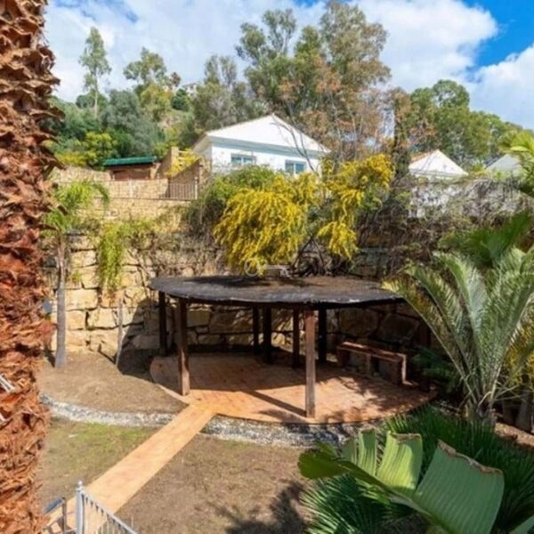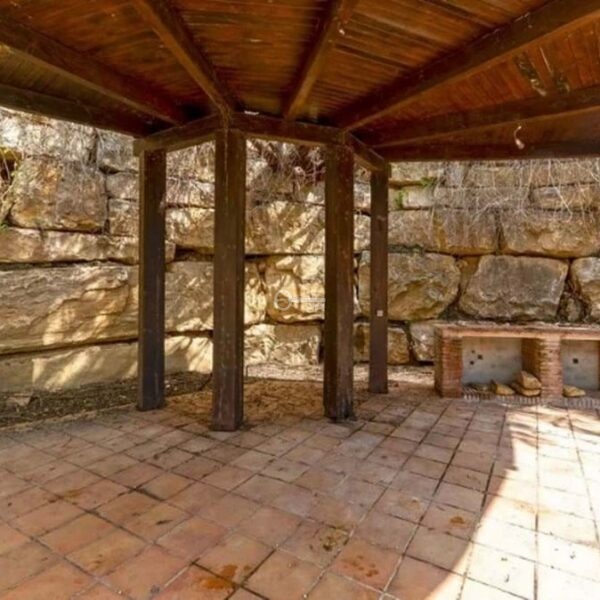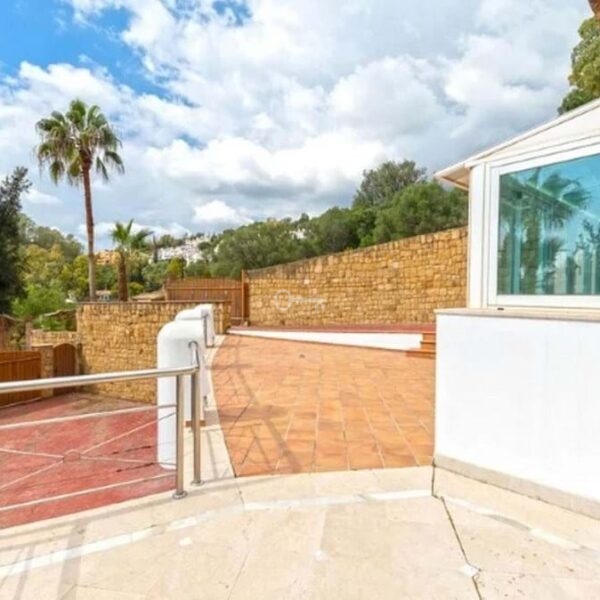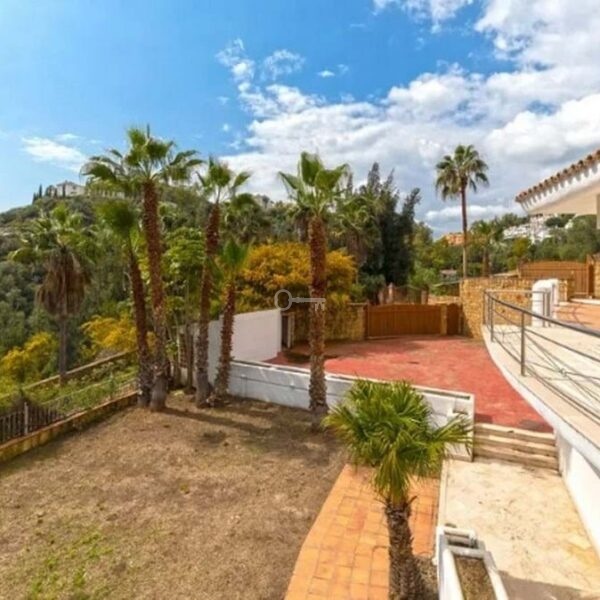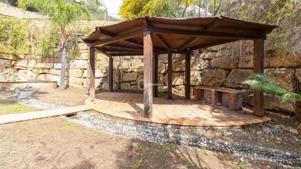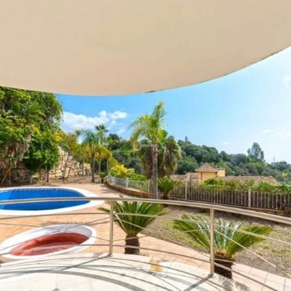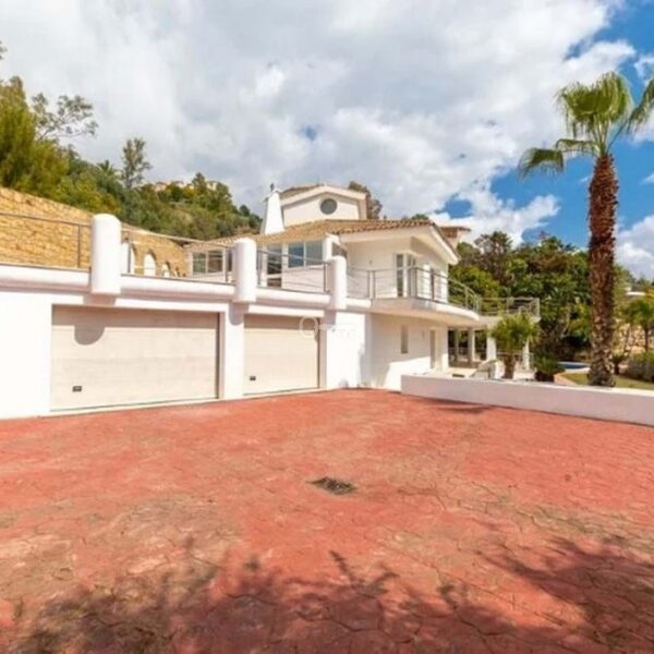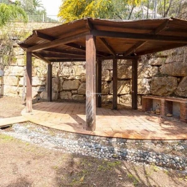 Detached house in the El Almendro Urbanization, Benahavís. It has a surface area of 919 m² distributed over 4 floors. The ground floor comprises a spacious living room, dining room, kitchen, access walkway to the hallway, 2 bedrooms with en-suite bathrooms, and 2 terraces. The upper floor, accessed from the street via the entrance porch, consists of an entrance hall, corridor, 1 bedroom with dressing room, 1 bathroom, and a terrace. The semi-basement level features a spacious garage with room for several vehicles, a games room, and two bedrooms with en-suite bathrooms. The basement level includes a bar area, dressing room, games room, and bathroom. The property sits on a 3,868 m² plot, which includes an entrance porch, parking area, and a large private garden with a swimming pool and jacuzzi, all with sea views. It comes equipped with built-in wardrobes, a fitted kitchen, a fireplace, and pre-installation for air conditioning. Located in a quiet residential area surrounded by several golf courses.