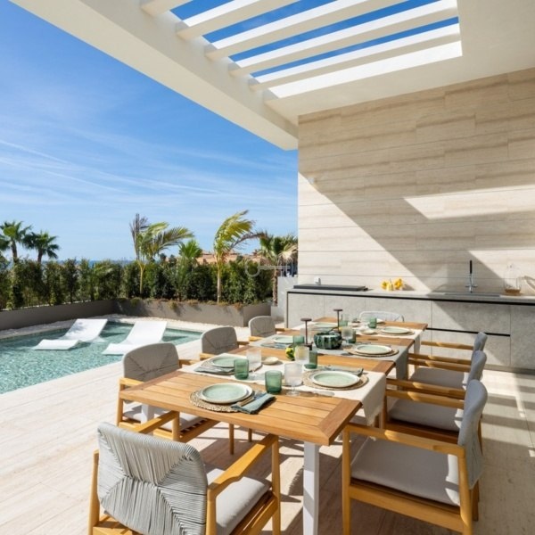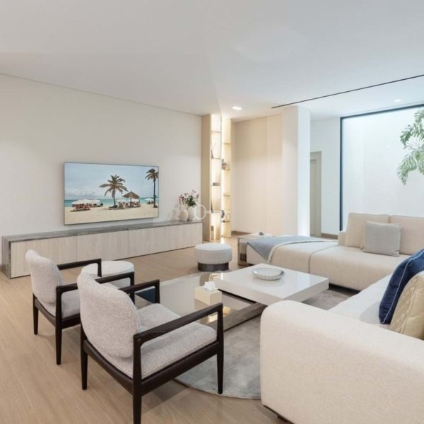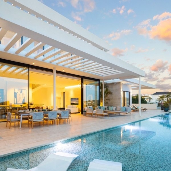 Wewnątrz, układ na otwartym planie płynnie przepływa między salonem, jadalnią i kuchnią, wzmocniony przesuwanymi drzwiami od podłogi do sufitu, które łączą wnętrze z tarasami. Projekt charakteryzuje się czystą, neutralną paletą i wysokiej klasy wykończeniami. Z sześcioma przestronnymi, elegancko zaprojektowanymi sypialniami, dom łączy komfort z nowoczesnym stylem.