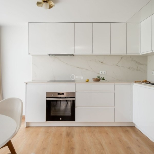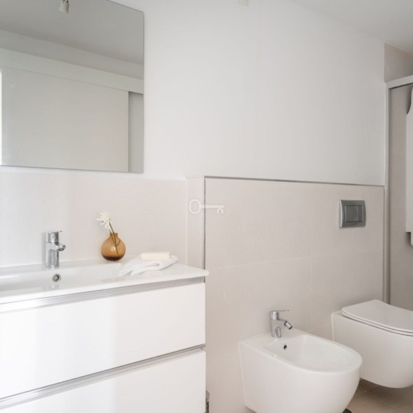 Wnętrze obejmuje trzy sypialnie, dwie nowoczesne łazienki (jedna z nich z łazienką) oraz dodatkowe pomieszczenie, które może służyć jako pralnia, gabinet lub potencjalna czwarta sypialnia.