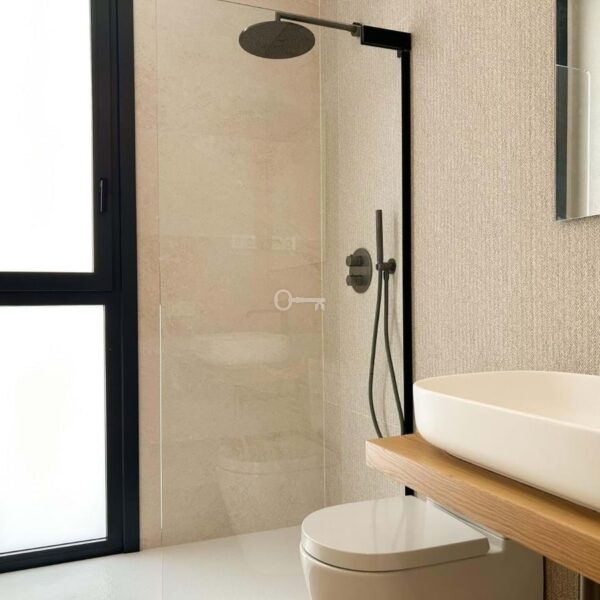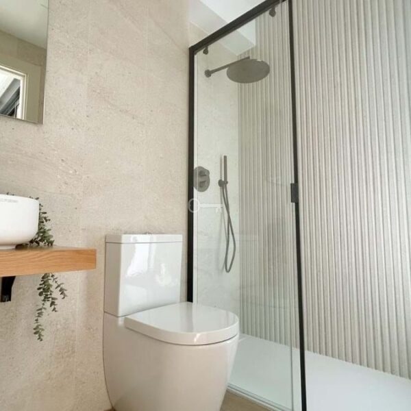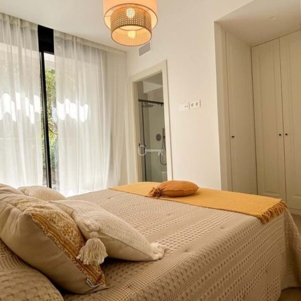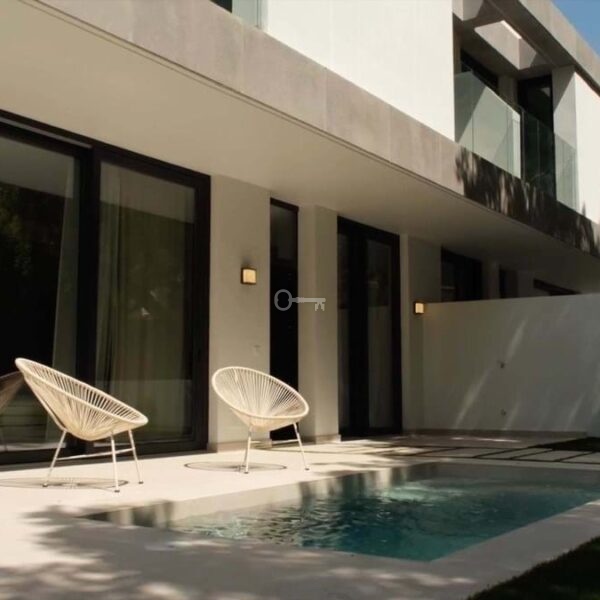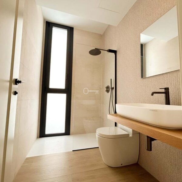 Main floor: Features a spacious, bright living room with a fully equipped open-plan kitchen, designed for both functionality and modern aesthetics. The living area opens directly onto a generous terrace with a private garden and swimming pool, ideal for enjoying the Mediterranean lifestyle. This level also includes a stylish guest toilet and the main bedroom with an en-suite bathroom, allowing for convenient single-level living if desired.