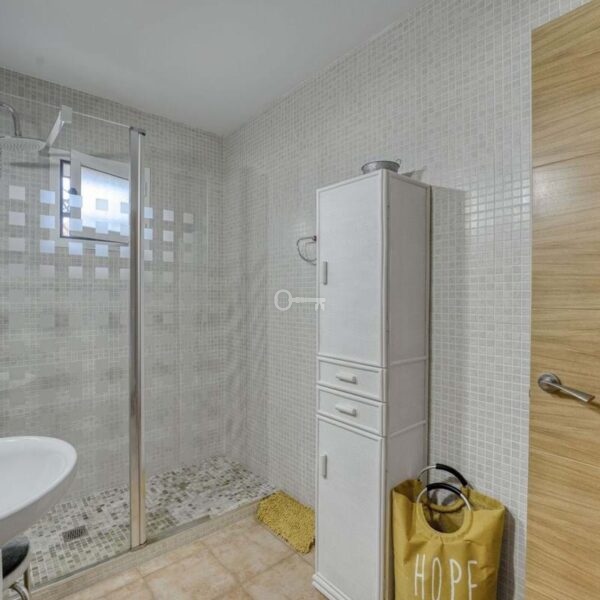 blue and white Formica furniture and Porcelanosa flooring, bathroom with Italian-style walk-in shower, living room fireplace with insert, PVC window shutters with motor, high-end appliances, etc.