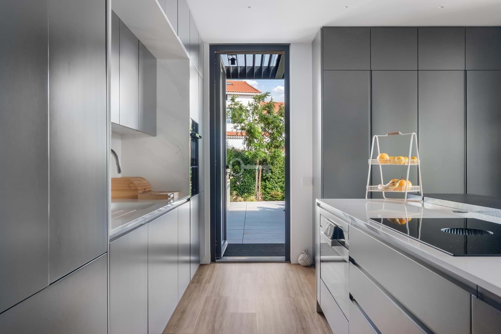 Nowoczesna, w pełni wyposażona kuchnia z przesuwanymi drzwiami, umożliwiająca eleganckie oddzielenie przestrzeni