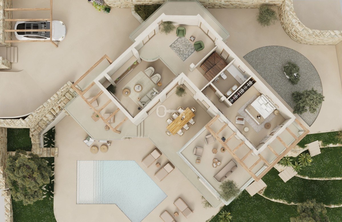 Od momentu wejścia do środka, projekt zaprasza do życia w harmonii z naturalnym otoczeniem. Niezależnie od tego, czy pijesz poranną kawę na jednym z rozległych tarasów, przygotowujesz posiłek w nowoczesnej kuchni na otwartym planie, czy relaksujesz się przy połyskującym basenie bez krawędzi, morze jest zawsze tłem, a naturalne światło przepływa przez każdy zakątek domu.