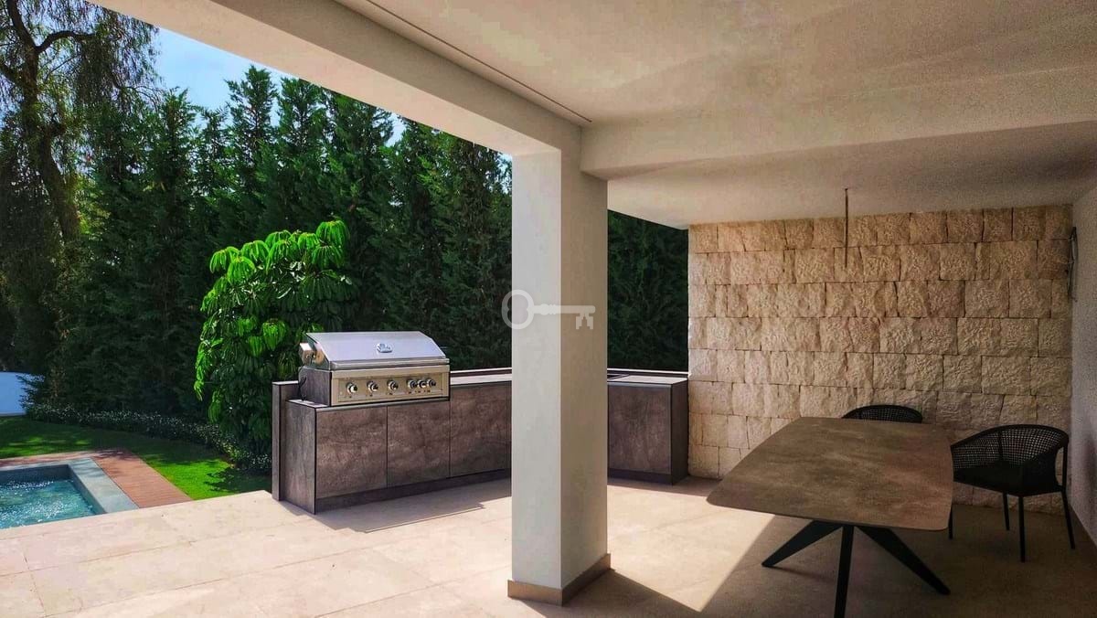Przestrzenie zewnętrzne willi są prawdziwą atrakcją, oferując płynne przejście między wewnętrznymi i zewnętrznymi obszarami mieszkalnymi. Rozległy taras z błyszczącym basenem bez krawędzi i leżakami stanowi idealne miejsce do spożywania posiłków na świeżym powietrzu, rozrywki lub po prostu wygrzewania się na słońcu. Bujny, starannie zagospodarowany ogród oferuje spokojne i prywatne odosobnienie, z wijącymi się ścieżkami, dojrzałymi drzewami i pachnącymi kwiatami, które tworzą prawdziwe poczucie spokoju.