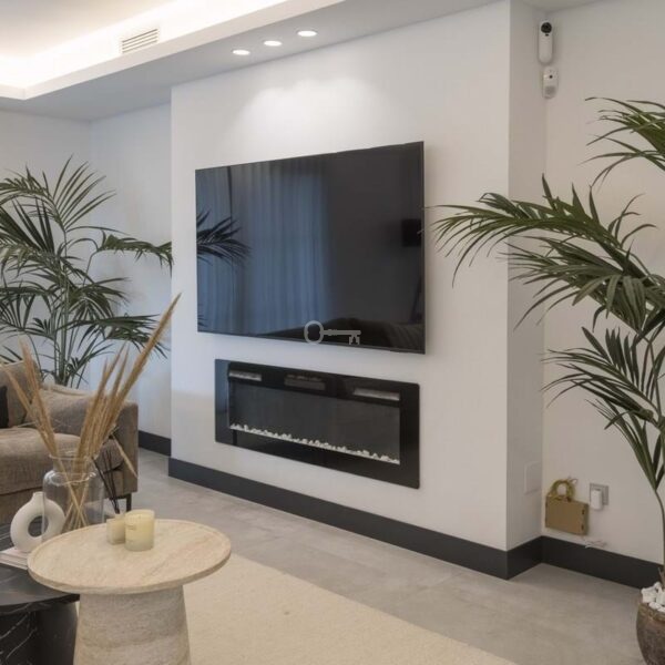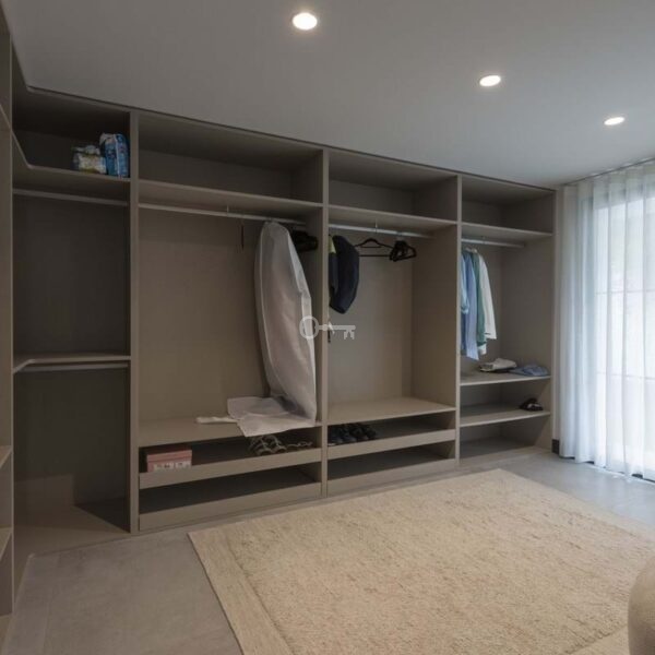 The home boasts a spacious open-plan living area that seamlessly connects with the kitchen, creating a warm and inviting atmosphere. The kitchen is equipped with high-end appliances and includes a wine room with a glass door. There’s also a TV room and another bedroom with an en-suite bathroom. A service/staff bedroom with its own bathroom completes the main layout.