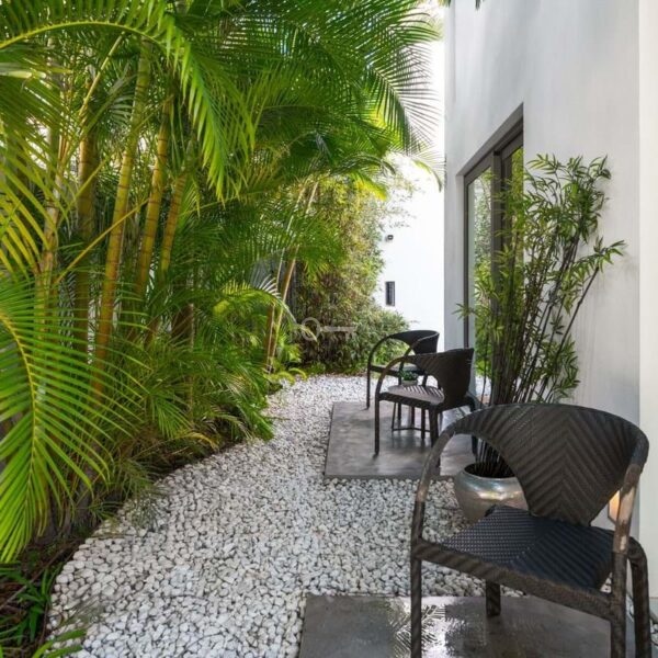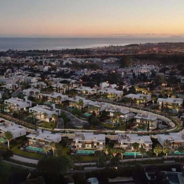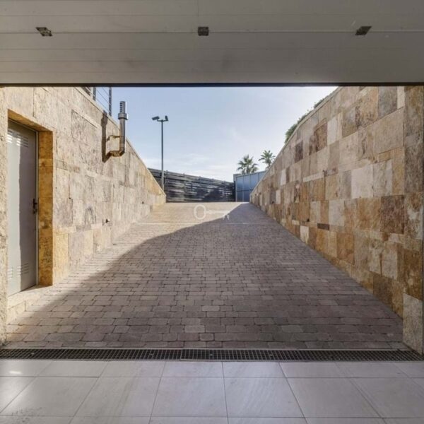 A semi-detached villa in the urbanisation, four bedrooms, four bathrooms, arranged with intent rather than habit: basement level below, an entrance floor with three en-suite bedrooms and a calm water feature setting the tone, a first floor dedicated entirely to open-plan living with terrace and private pool, and a second floor reserved for a full-width master suite with walk-in wardrobe, private bathroom and sea-facing terrace. A private lift connects every level, from garage to rooftop calm, without interruption.