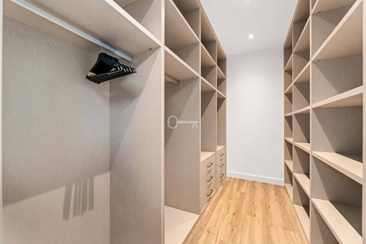 A main suite with a luxurious dressing area and a bathroom finished with refined materials