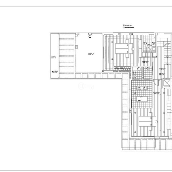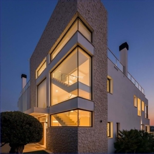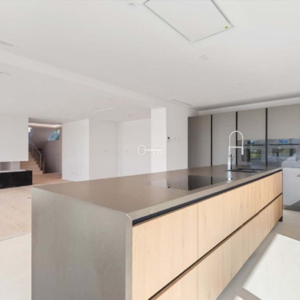 Obszerny salon wita wejście z przyległą jadalnią i dużą otwartą nowoczesną kuchnią oddzieloną imponującym centralnym kominem gazowym. Podwójnie szklane, przesuwne drzwi z elektrycznymi żaluzjami prowadzą z salonu na duży, zadaszony taras, otaczający basen z widokiem na panoramę miasta, z opcją ogrzewania zainstalowaną fabrycznie.