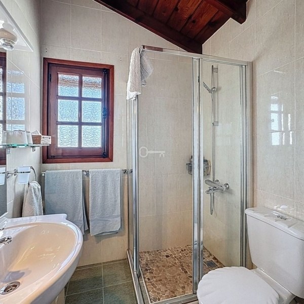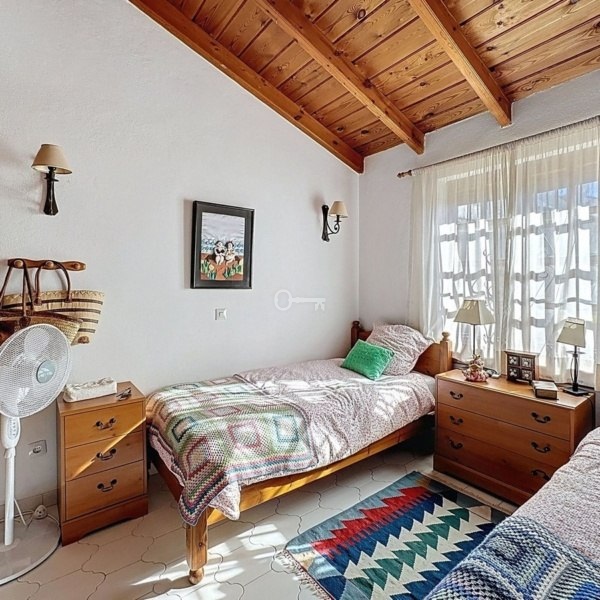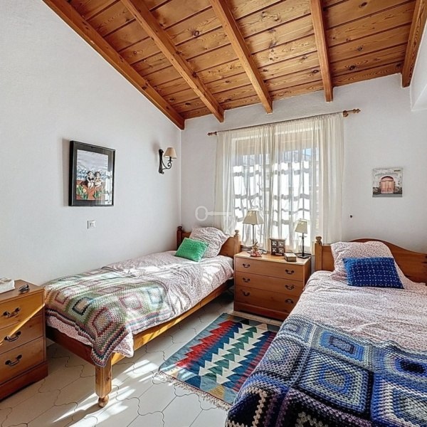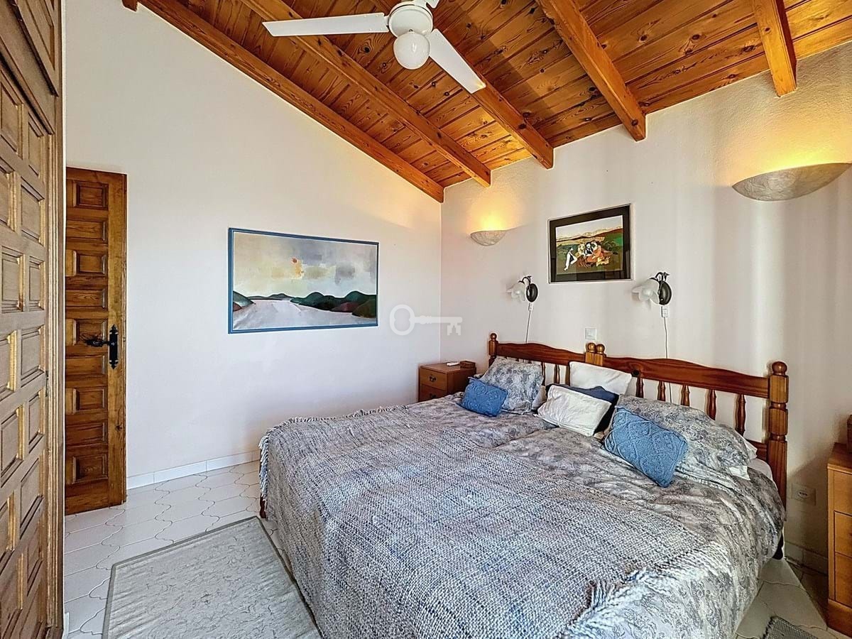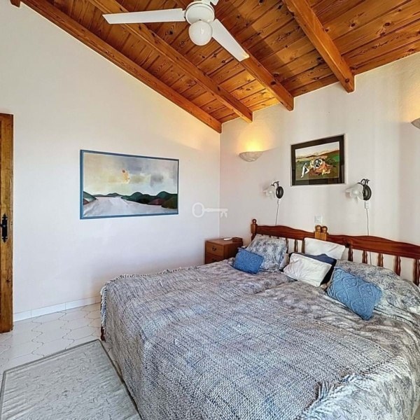 Główna sypialnia z łazienką znajduje się na niższym poziomie, co zapewnia dodatkową prywatność, podczas gdy na piętrze znajdują się dwie dodatkowe sypialnie z wbudowanymi szafami, wspólna łazienka i otaczający prywatny taras ze spektakularnym widokiem na morze.