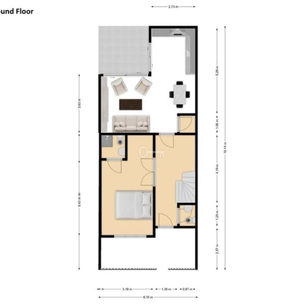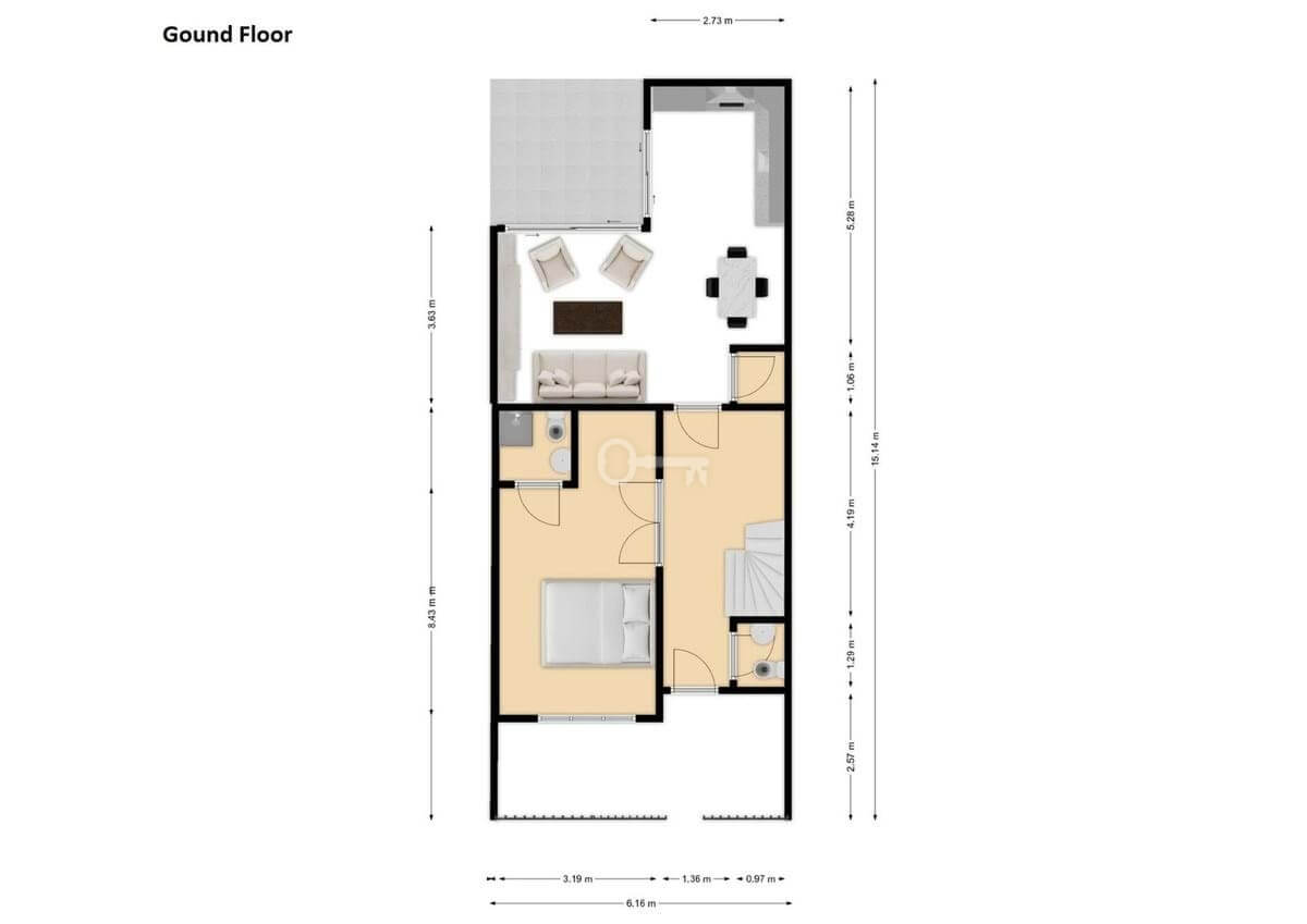 Parter: salon z jadalnią, w pełni wyposażona kuchnia na otwartym planie, 1 sypialnia z łazienką, toaleta dla gości i 2 patia