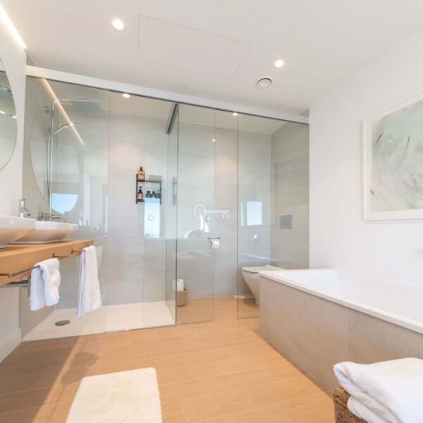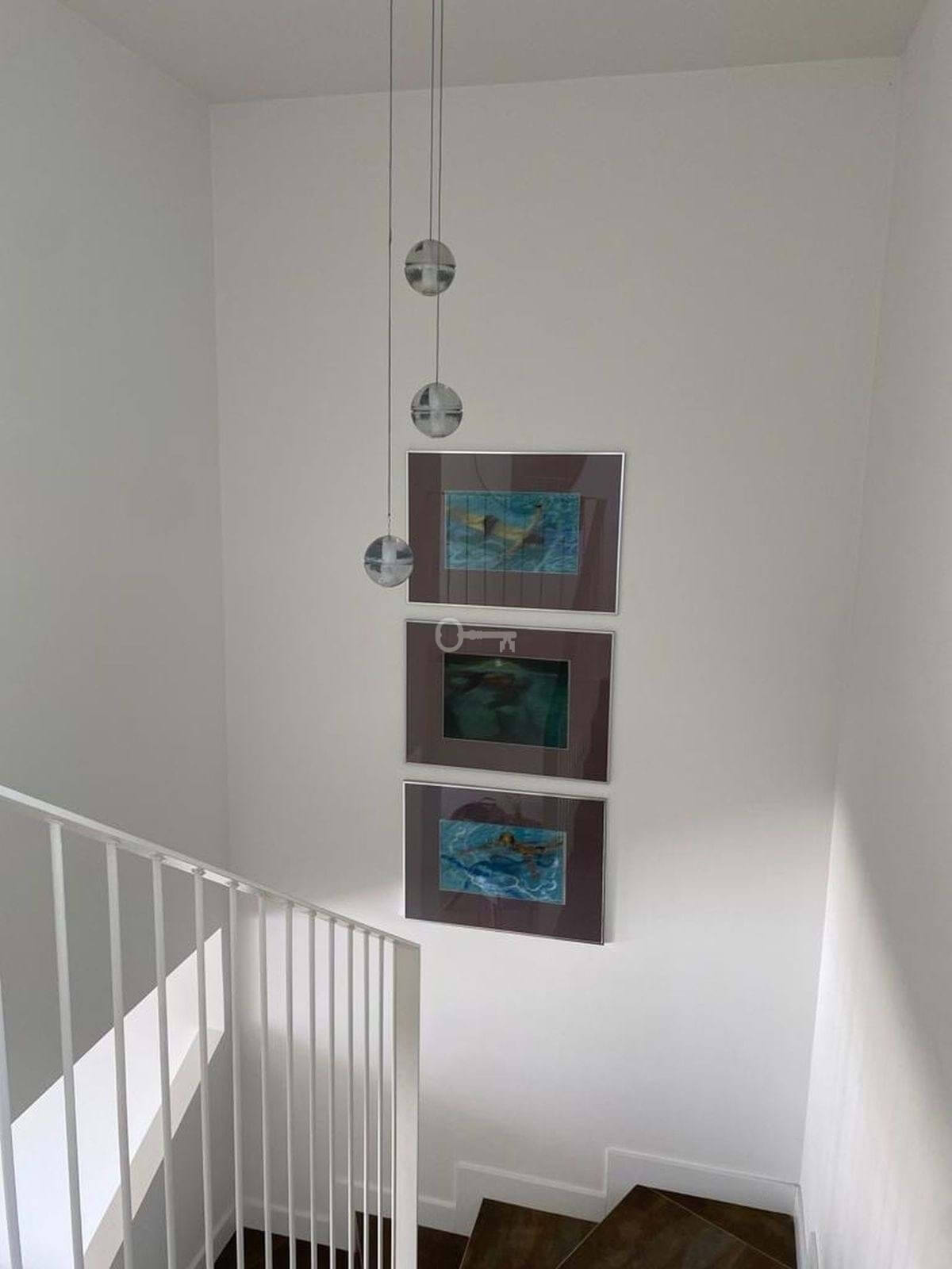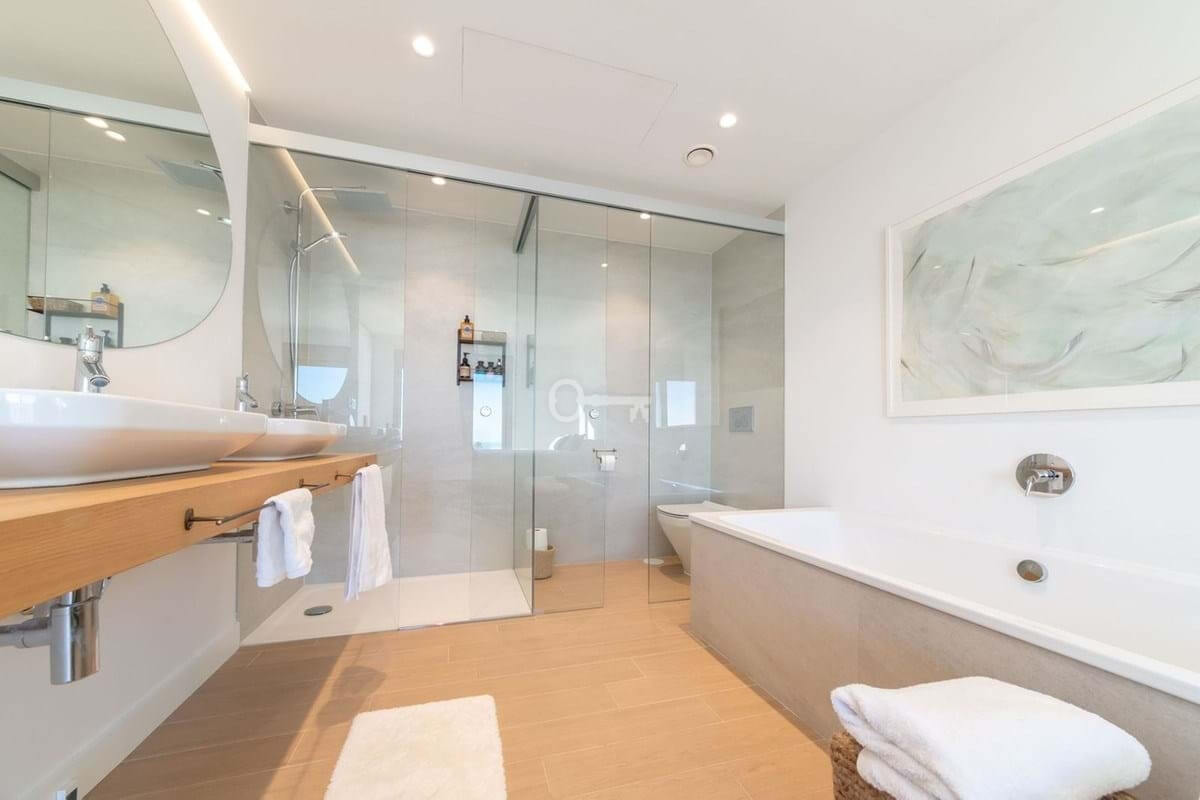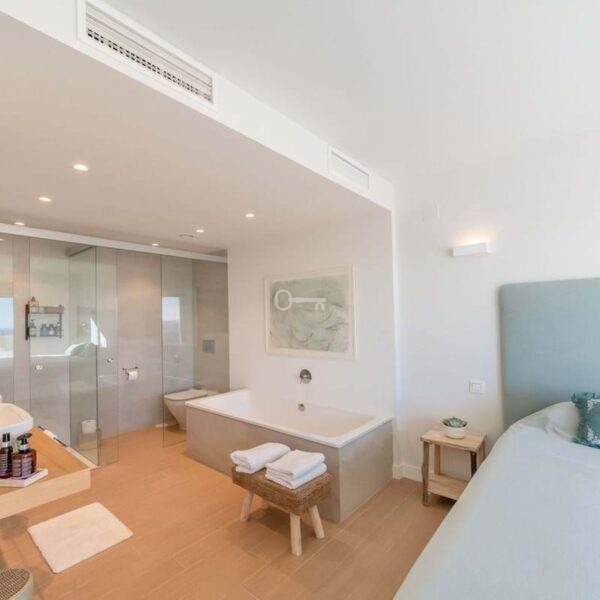 Na piętrze znajdują się trzy sypialnie, w tym główna z prywatną łazienką z prysznicem i wanną. Pozostałe dwie sypialnie dzielą dodatkową łazienkę. Dwie sypialnie mają dostęp do kolejnego dużego tarasu, idealnego do wygrzewania się na słońcu i podziwiania widoków.