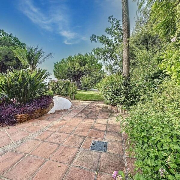 The outdoor area is a real highlight of this property. It includes a private swimming pool, surrounded by a well-maintained garden filled with lush grass and vibrant flowers, creating a serene and picturesque setting. A charming pergola provides a shaded space for al fresco dining or lounging, while the sea views add an extra touch of luxury.