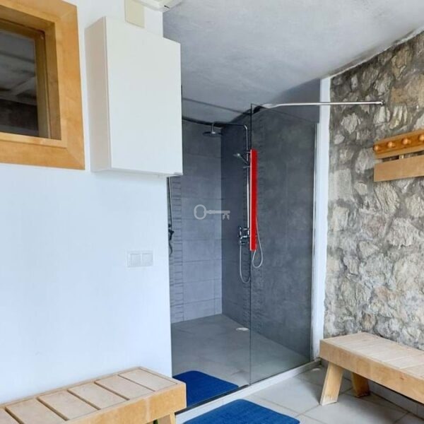 The lower level includes spacious living areas, two bedrooms, two bathrooms, a wine cellar and a sauna area with a dressing room and showers. The upper level features another fully equipped kitchen, an open living and dining area, two bedrooms, two bathrooms, a multipurpose room and a large glazed terrace with views towards the sea and mountains.