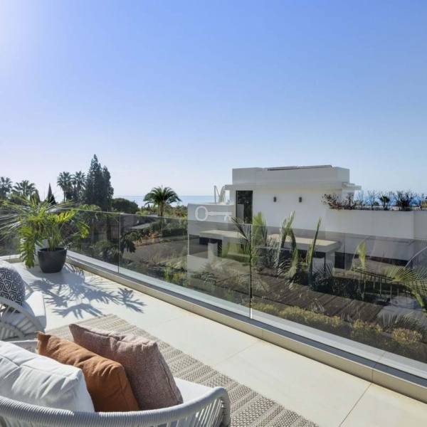 Górny taras o powierzchni 98 m2 oferuje panoramiczne widoki na morze i góry i jest idealny do rozrywki na świeżym powietrzu. Obejmuje on strefę relaksu, łazienkę i schowek.