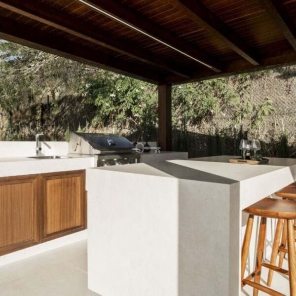 Na zewnątrz wiele miejsc do siedzenia i jadalni w pełni wykorzystuje śródziemnomorski klimat, zapewniając wszechstronne przestrzenie do posiłków na świeżym powietrzu, odpoczynku lub rozrywki w całkowitym spokoju. Nowoczesne udogodnienia, takie jak system automatyki domowej Lutron i wodne ogrzewanie podłogowe w całej willi, zapewniają całoroczny komfort i wydajność.