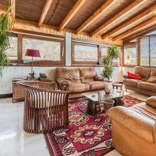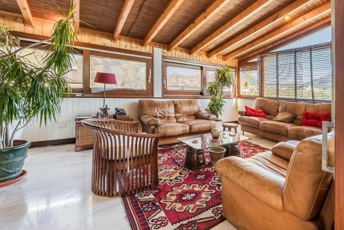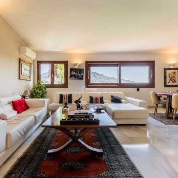 The second level opens into a spacious main lounge leading to a covered terrace with seating and barbecue area, overlooking the garden, heated pool, surrounding mountains and the Marbella skyline.