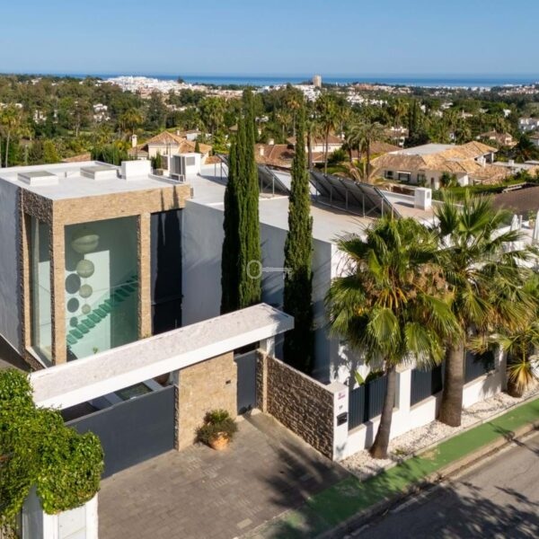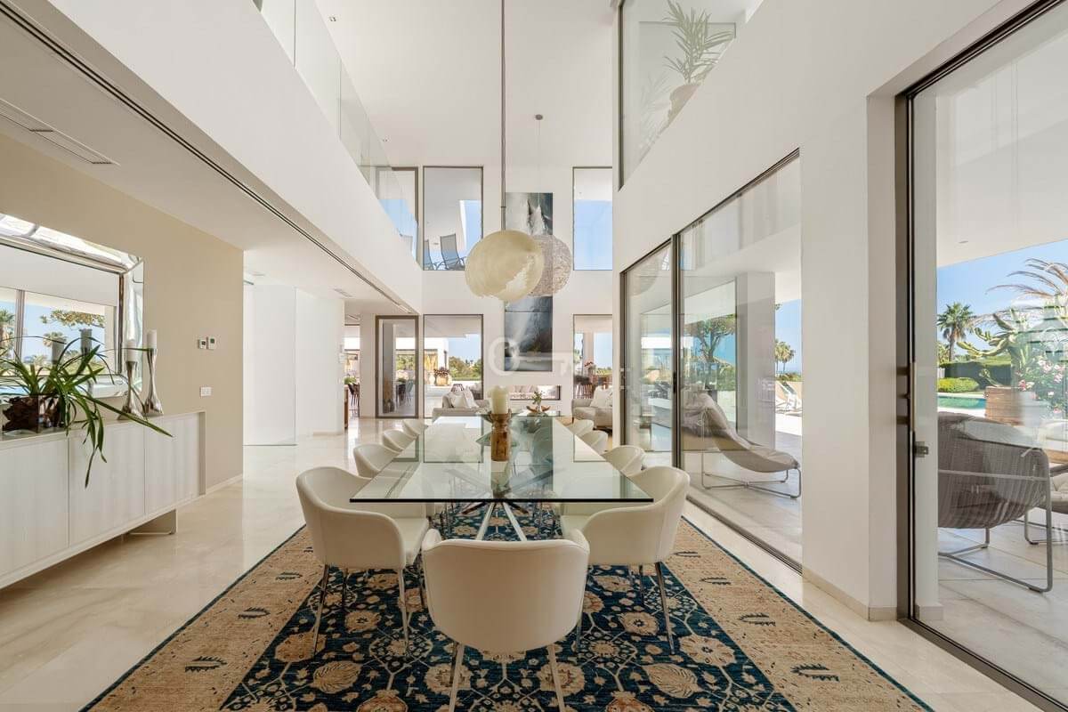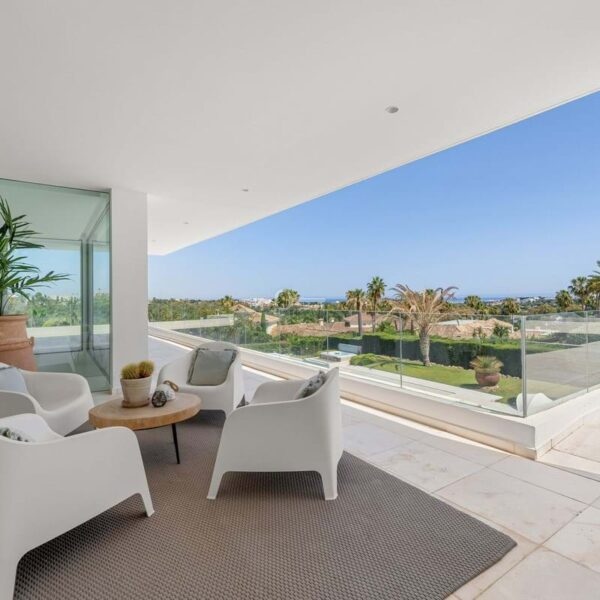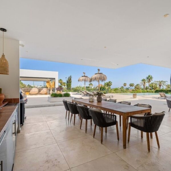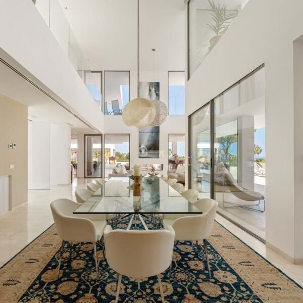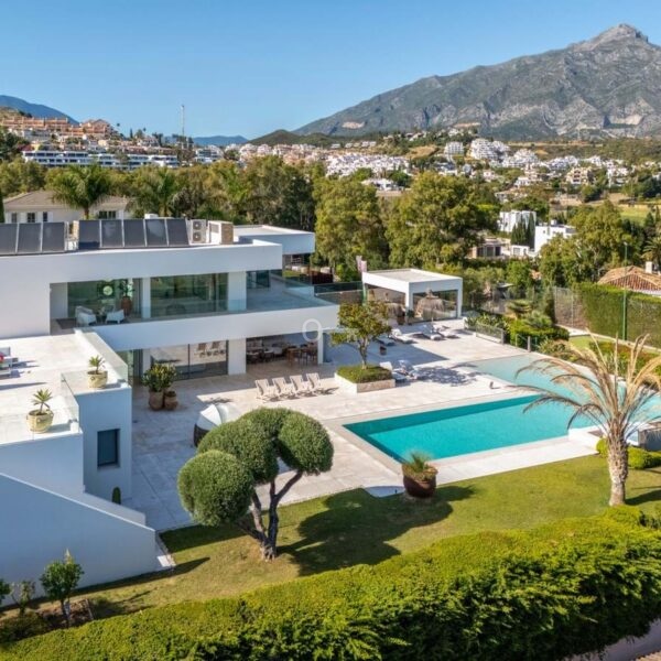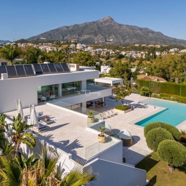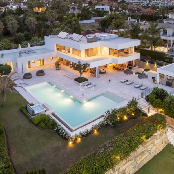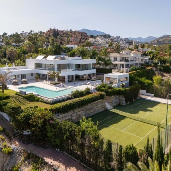 Stunning contemporary villa located in the prestigious neighbourhood of La Cerquilla, nestled in the heart of Nueva Andalucías Golf Valley. This exclusive seven bedroom residence offers exceptional privacy and breathtaking panoramic views of Marbellas iconic La Concha mountain and the Mediterranean coastline. With its prime location near top golf courses, international schools, upscale restaurants, and the vibrant Puerto Banús marina, it represents a superb investment and lifestyle opportunity. Inside, the villa features expansive interiors thoughtfully designed with natural textures and refined finishes. Soaring ceilings, elegant lighting, and a harmonious indoor-outdoor flow define the main living areas. Custom furnishings, organic materials, and curated decor elements, such as woven wall art and hand-crafted ceramics add character and warmth throughout the home. The upper level presents a tranquil, gallery-style corridor overlooking the main floor, leading to serene bedrooms with sweeping views and private terraces. At the heart of the villa is a sleek, modern kitchen equipped with premium appliances and contemporary cabinetry, flowing into a spacious glass-enclosed dining area with floor-to-ceiling windows. Outdoor living is elevated with a striking pool and jacuzzi, Balinese-style sun loungers, and a covered dining terrace complete with a fireplace and barbecue ideal for entertaining year-round. A unique highlight is the private tennis court at the foot of the garden, offering a perfect recreational space for residents.