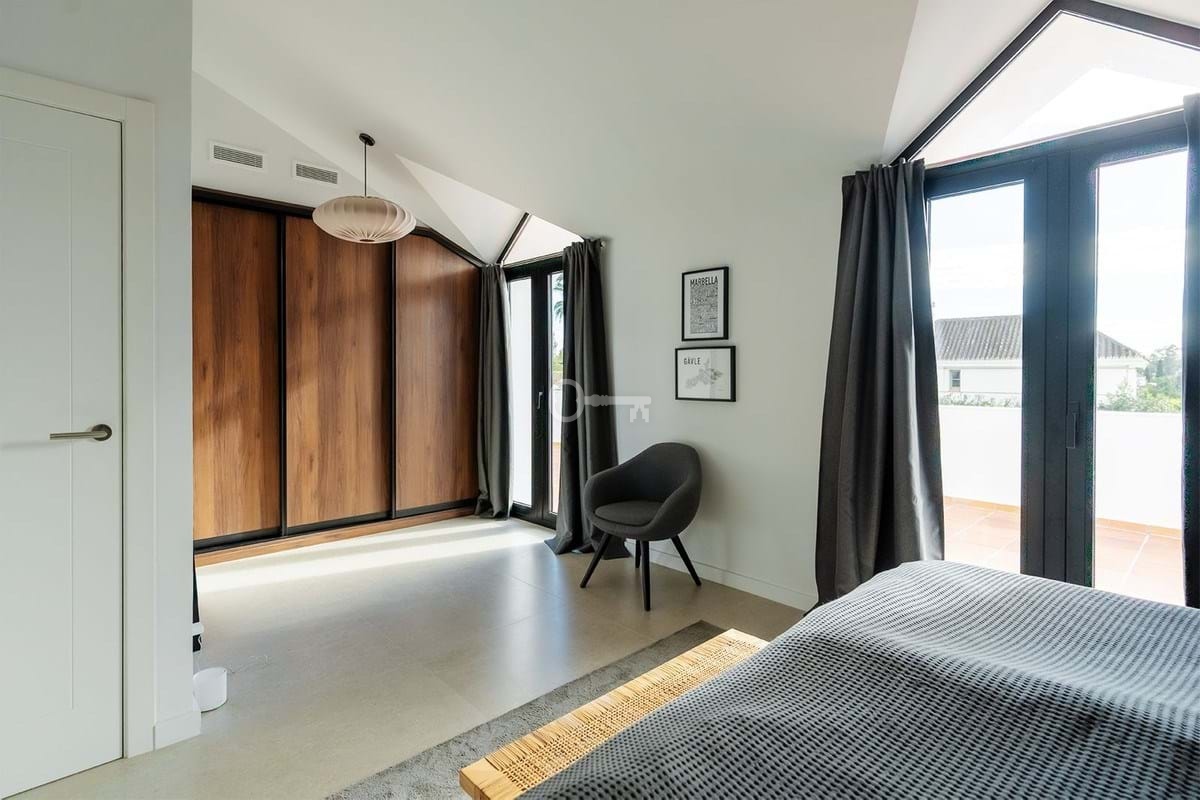 Górne piętro z dwiema sypialniami z łazienkami i balkonem dostępnym z obu pokoi z pięknym widokiem, z którego można wyczuć La Concha i pole golfowe Los Naranjos.