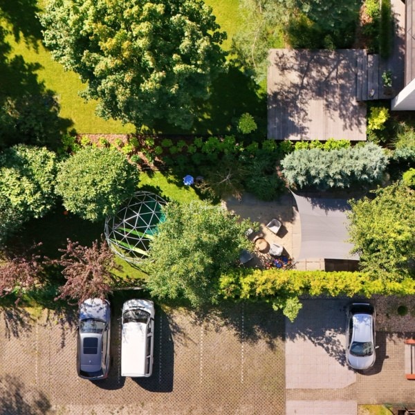 * Ogród w 3 strefach: część rekreacyjna z leżakami, zielona przestrzeń z nasadzeniami, miejsce na ognisko i zadaszoną strefą relaksu.