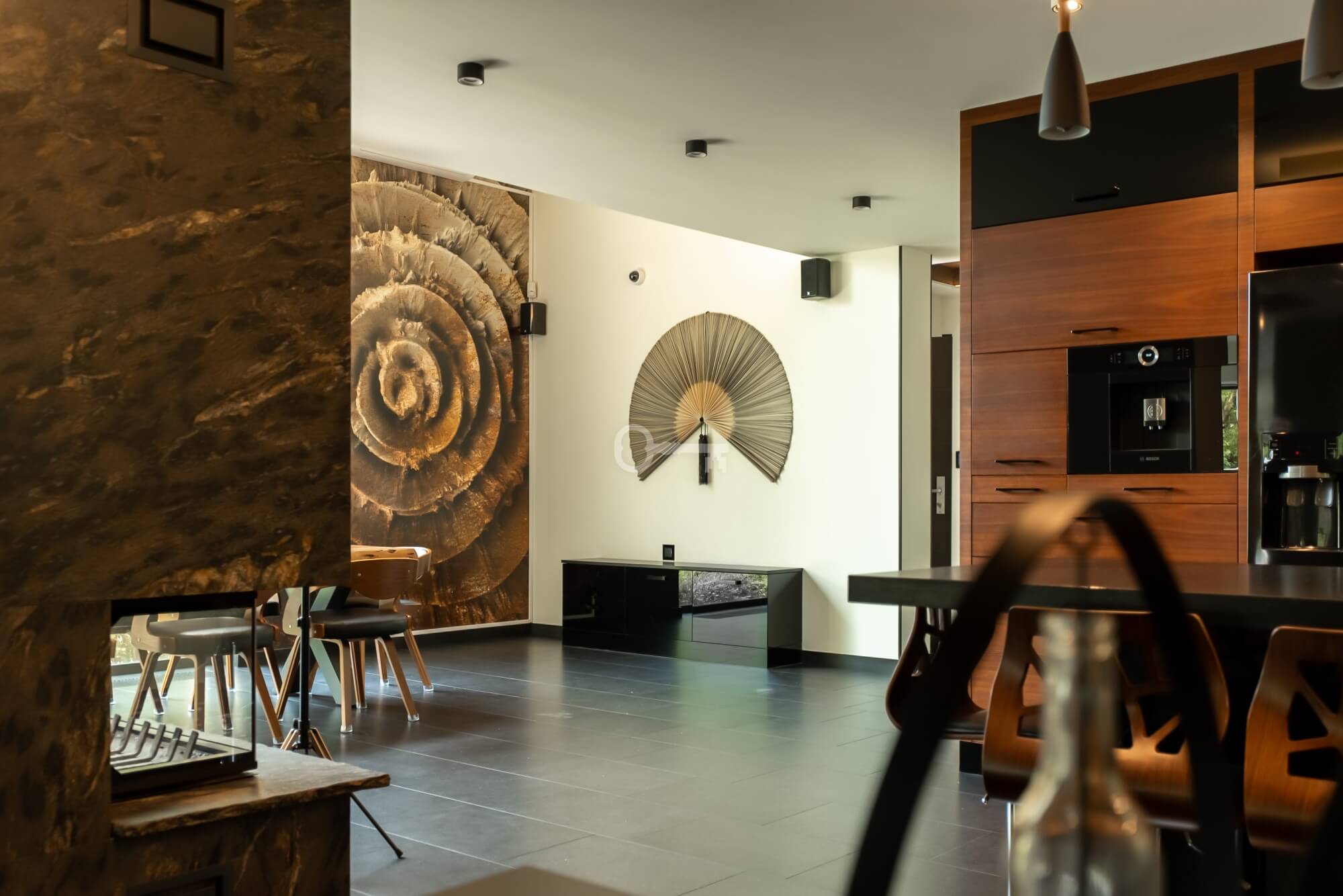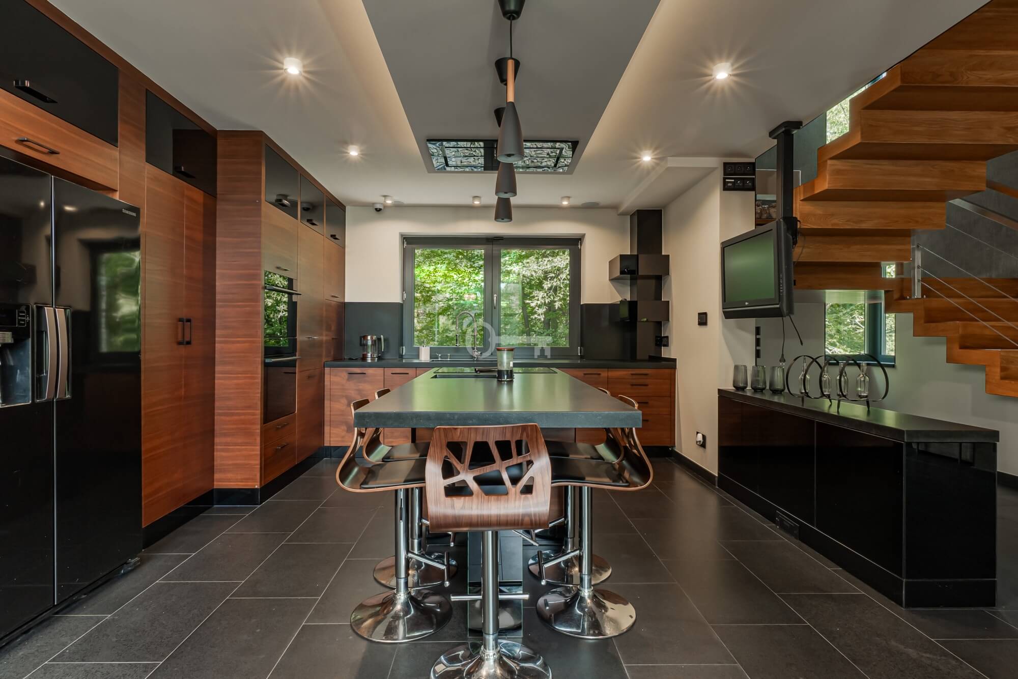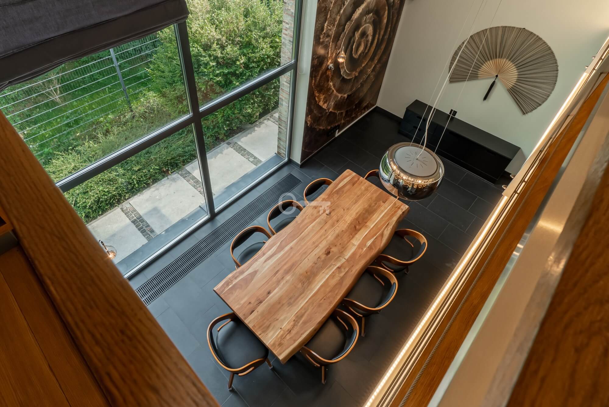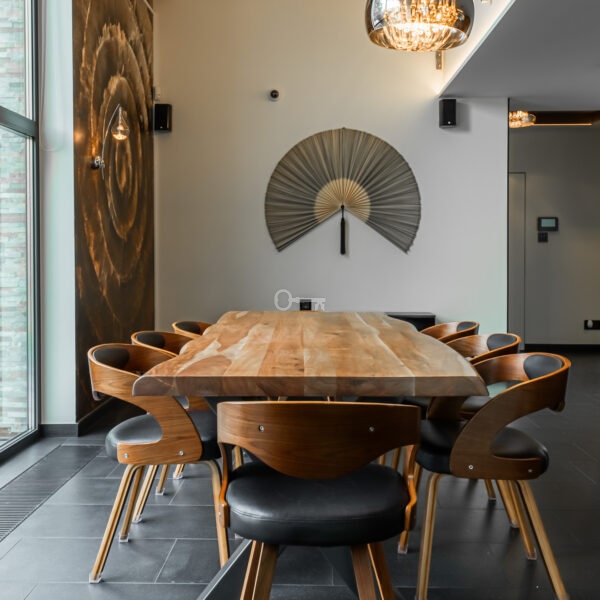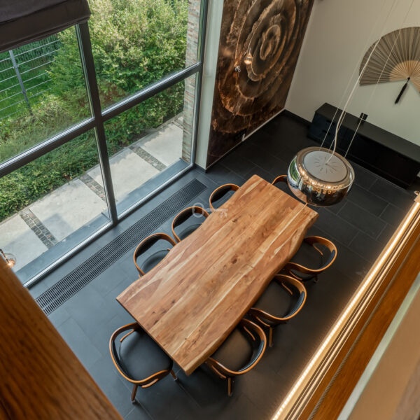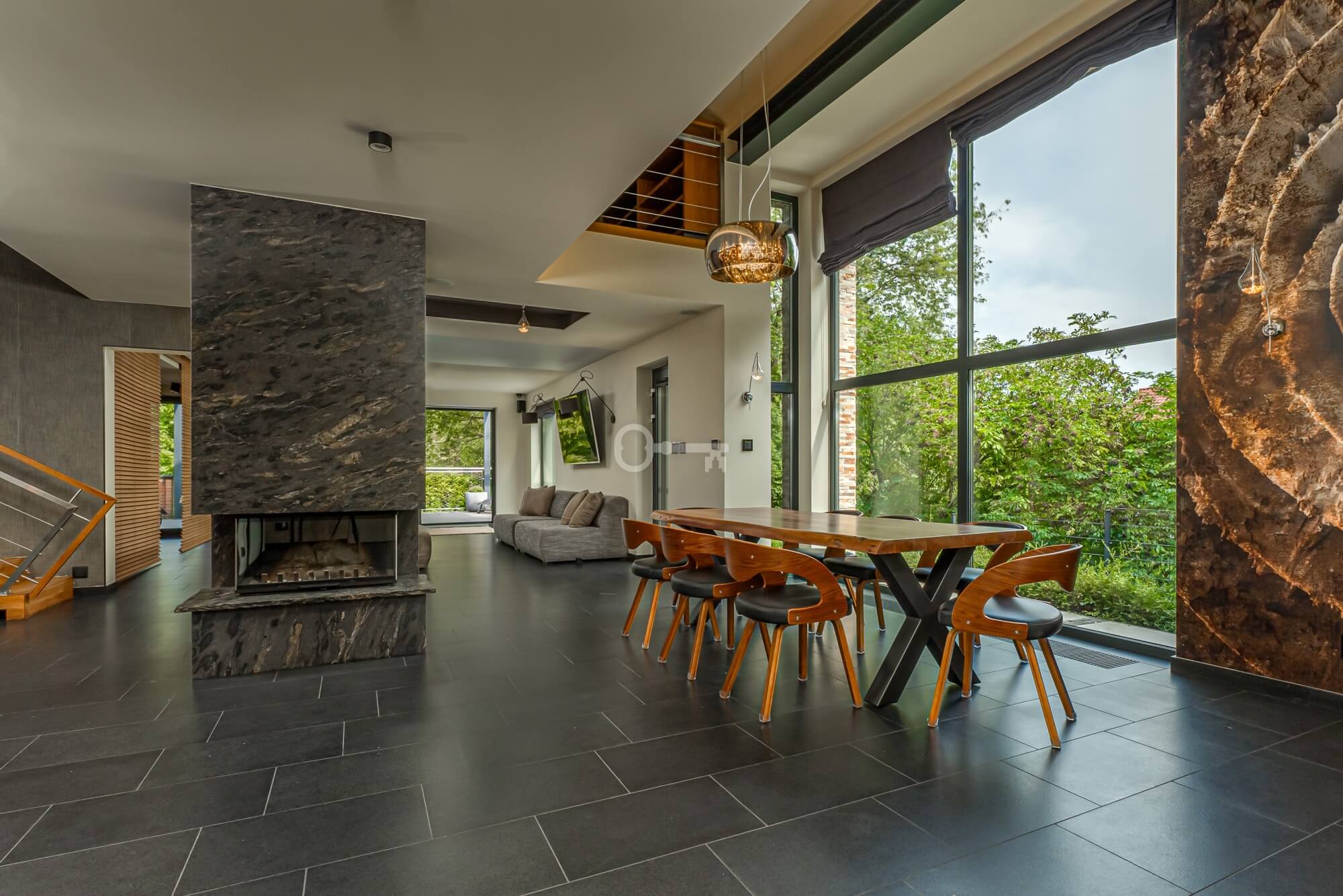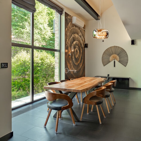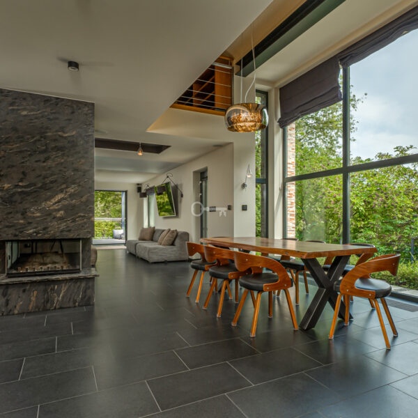 Jednocześnie, to prawdziwa prywatna rezydencja. Właściwie jedynym sąsiadem jest chroniony rezerwat przyrody, a w domu po prostu przyjemnie się przebywa. Jets niezwykle przestronny, bardzo dobrze doświetlony dzięki imponującym przeszkleniom i otoczony z każdej strony zielenią. Dodatkowo, poza przestrzenią wewnątrz, atrakcyjna jest też przestrzeń dookoła domu dzięki intymnemu, dużemu tarasowi (z własnym piecem do pizzy) oraz obszernej działce.