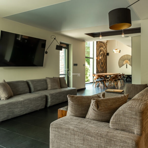 Nieoczywiste położenie domu to jedna z jego największych zalet. Z jednej strony, nie więcej niż spacer dzieli nas od Miasteczka Wilanów, przystanku tramwajowego, a także licznych dostępnych tam restauracji, kawiarni, sklepów czy prestiżowych szkół międzynarodowych. Z drugiej natomiast, nieruchomość położona jest już właściwie na terenie rezerwatu przyrody i może pochwalić się niesamowitą ciszą, wszechotaczającą zielenią i niespotykaną prywatnością.