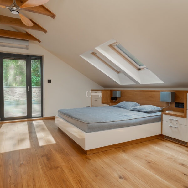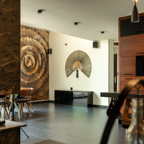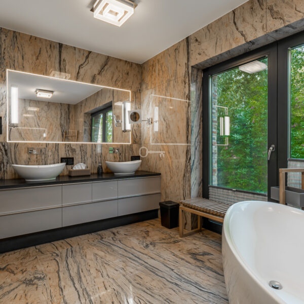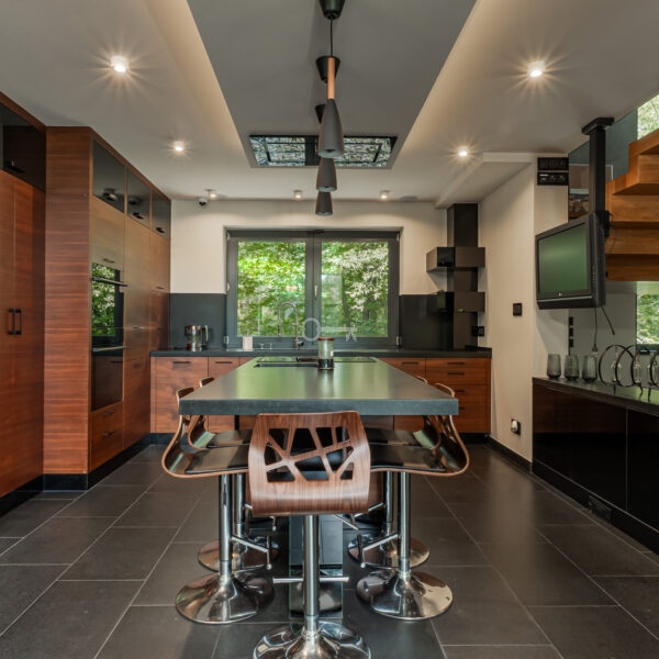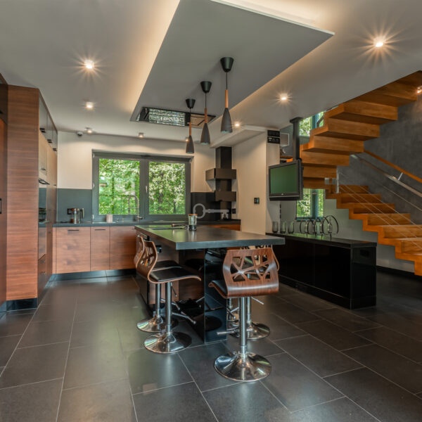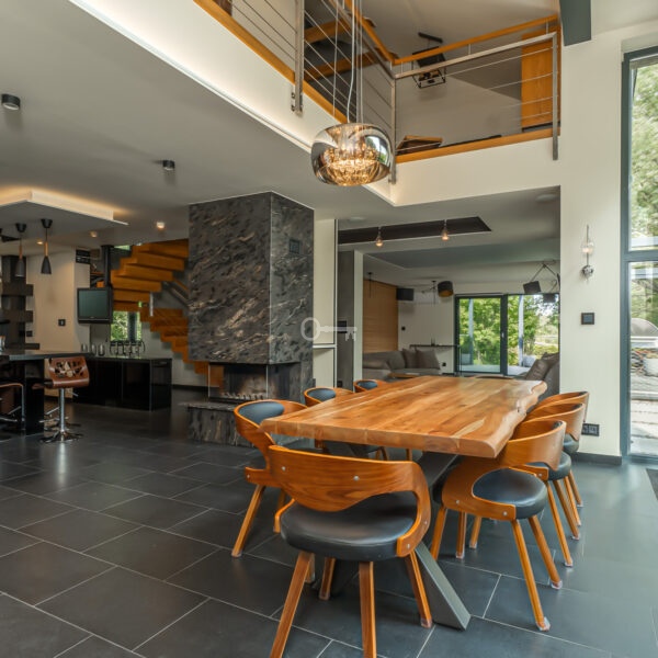 Dom, który Państwu oferujemy to nieruchomość wyjątkowa. Wykończona przy użyciu materiałów bardzo wysokiej jakości, na podłodze położono kamienne płytki oraz lite, drewniane deski, łazienki zostały całe wykończone w kamieniu, tak jak i kominek, zamontowano aluminiową stolarkę okienną, a na elewacji położono bardzo atrakcyjną cegłę dekoracyjną. Wykorzystano też wszelkie nowoczesne technologie gwarantujące wygodne życie. Klimatyzacja, system filtracji wody, ogrzewanie podłogowe, pompa ciepła, fotowoltaika, własny agregat prądotwórczy, system alarmowy i monitoringu czy rozbudowany system smart home to te, o których szczególnie warto wspomnieć.