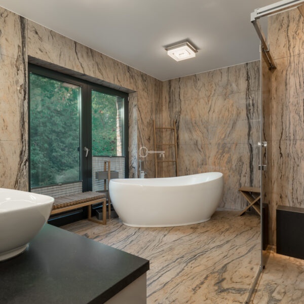 * duża łazienka z wanną i prysznicem,
