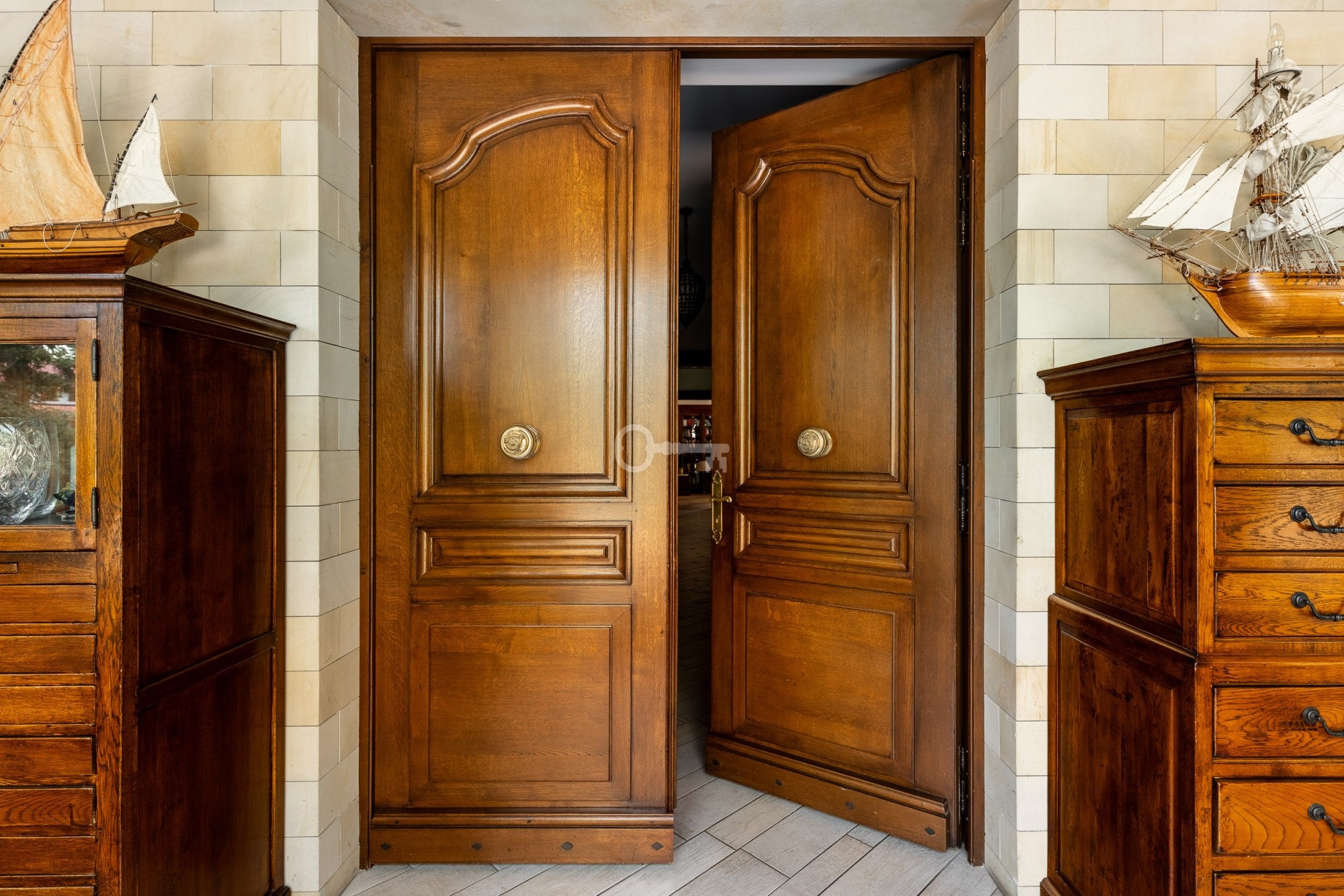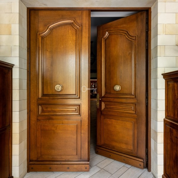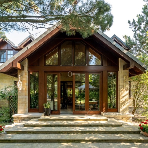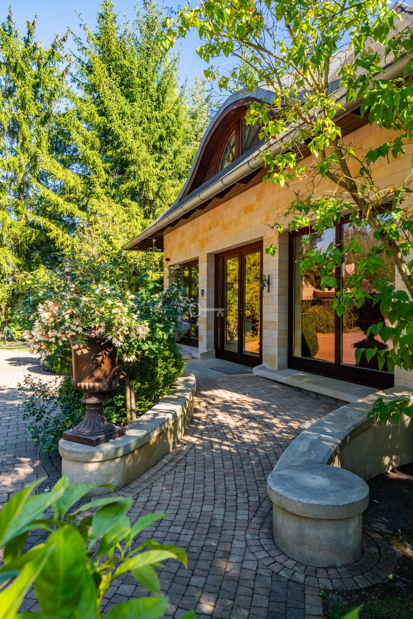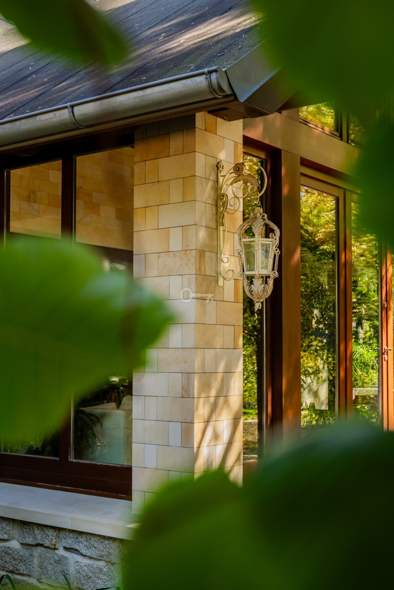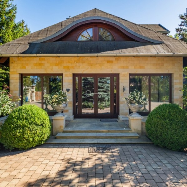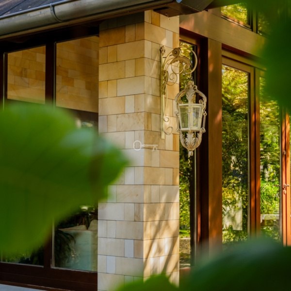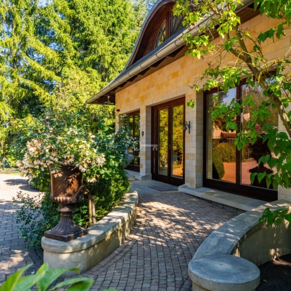 Rezydencja główna swoim charakterem odwołuje się do tradycyjnych willi francuskich – szlachetna bryła obłożona piaskowcem, harmonijne proporcje, a w nim klimatyczna oranżeria otwierająca się na ogród oraz monumentalne drzwi wejściowe. Te reprezentacyjne wysokie drzwi, wykonane z litego dębu, powstały na wymiar w paryskiej manufakturze specjalizującej się w unikatowych projektach portali wejściowych, co czyni je wyjątkowym elementem domu.