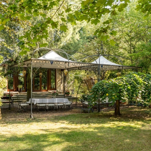 Cała nieruchomość otoczona jest zielenią – ogród krajobrazowy, sad owocowy i przestrzeń rekreacyjna zapewniają wyjątkowe warunki do odpoczynku.